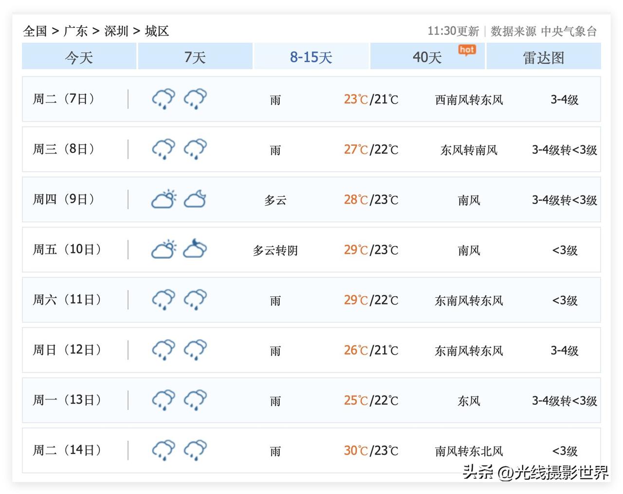广东省深圳市,4月1日到8日,可能每天都会下雨……尤其是清明节假期和全国各地春假期间……4月4日到6日,深圳每天都要下雨……中央气象台的最新天气预报,广州,深圳,珠三角,天气大趋势基本都一样。 4月4日,星期六,深圳中雨转多云。 4月5日,星期天,深圳雷阵雨。 4月6日,星期一,深圳中雨转小雨。 4月7日,星期二,深圳下雨。 4月8日,星期三,深圳下雨。 …… 好在,超级计算机认为,4月9日和10日,深圳可能会出太阳,大家到时候可以抓紧时间洗洗晒晒。