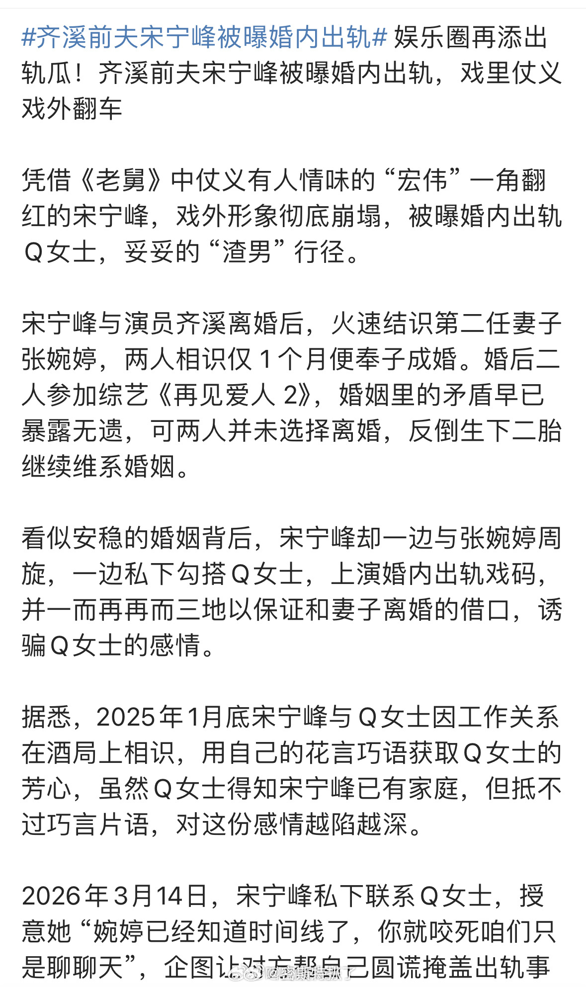 总结一下宋宁峰出轨喜瓜1.宋宁峰和齐溪离婚后,衔接张婉婷,闪婚闪生子。2.婚后宋