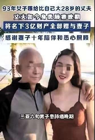 在海南三亚,一名年逾六旬男子因肺癌晚期,将名下价值3亿人民币的财产全部赠予90后妻子。 两人结婚多年,感情稳定,在男子患病期间,妻子一直陪伴左右,悉心照料,并支持他进行化疗。整个过程中,她并未主动提及财产相关问题,更多精力放在照顾丈夫、配合治疗上。 该男子此前有过一段婚姻,并有两名子女,在财产处置上本有多种安排。他最终将全部资产赠予妻子,更多是对多年相伴相守的认可,也是对妻子悉心照顾的回应。 在不少人看来,较大的年龄差距与巨额财产叠加,很容易让人产生功利性的猜测。但从实际相处来看,这段关系更多体现在日常陪伴与病中照料,婚姻的核心依旧是彼此的信任与依靠。 感情是否长久,并不由年龄差距或财富多少决定,关键在于困境中的态度与日常的相处。外界的议论往往只看到表面条件,却忽略了当事人之间真实的情感与付出。 将全部财产赠予对方,是当事人在特殊阶段做出的选择,既体现了对伴侣的肯定,也反映出对未来生活的安排。不必用固有偏见去评判他人的选择,尊重当事人的决定与情感,或许才是更理性的态度。