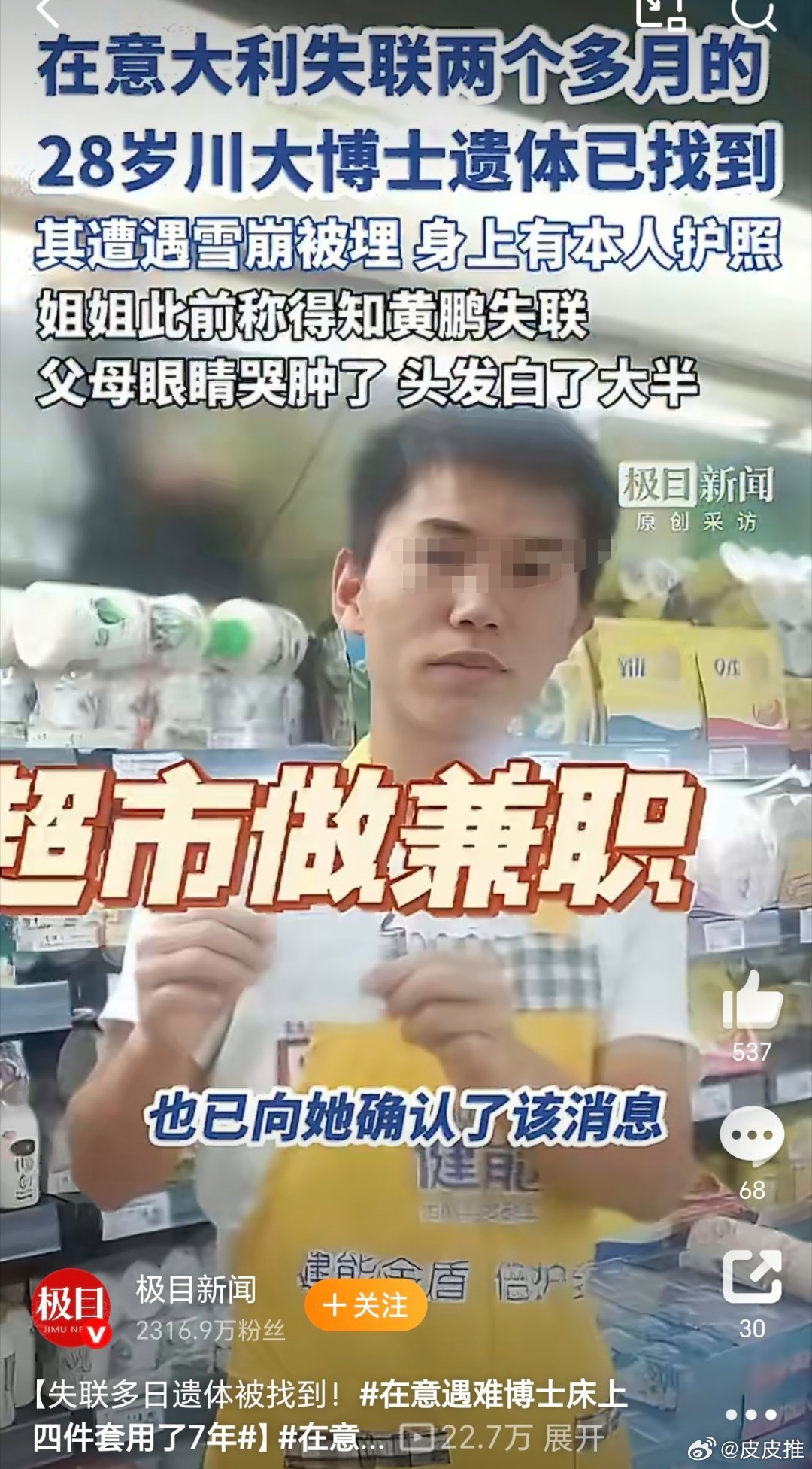 父母搬砖供出的博士在意遇难据红星新闻,失联2个多月的28岁川大博士黄鹏,最终被证
