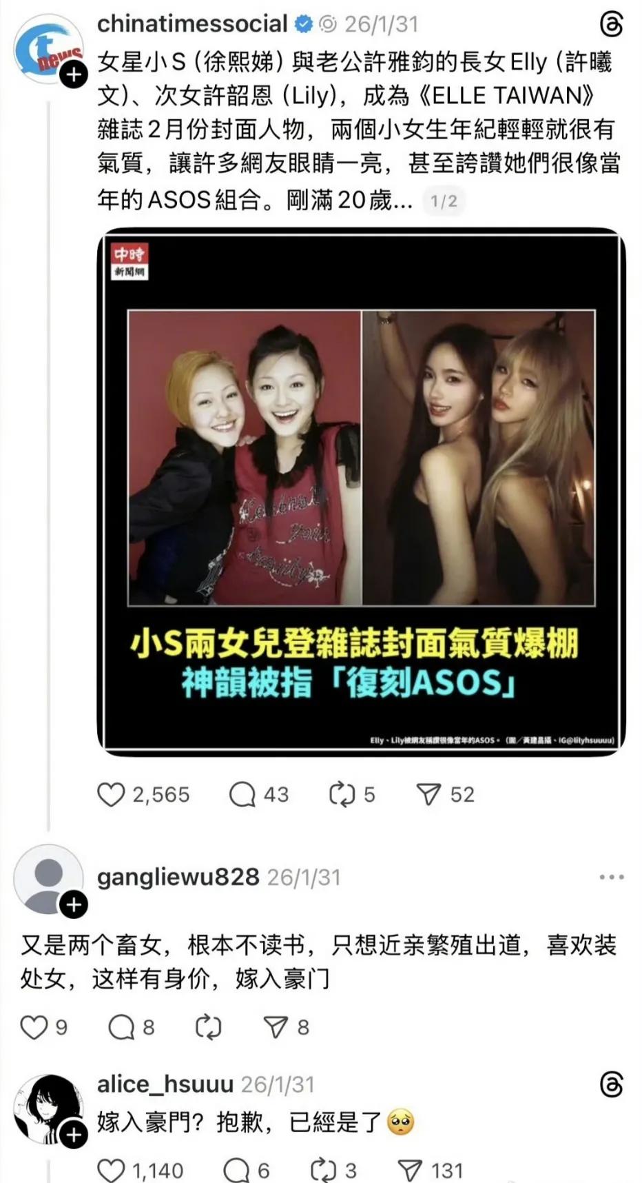 小S小女儿许老三霸气护姐引发热议。 Elly及Lily登上時尚杂志封面,遭到网
