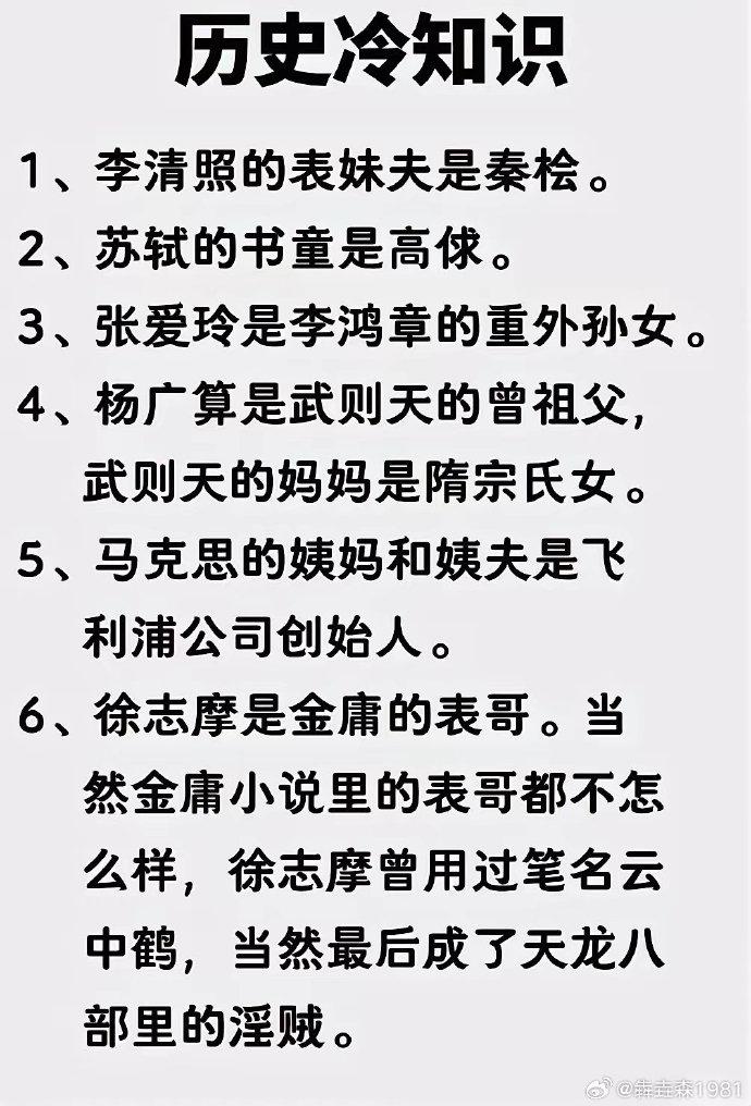 时空错乱的20个历史冷知识,原来他们真的是同一个时代! 1. 秦始皇 & 刘邦:差3岁。一个统一六国,一个建立大汉,感觉像是两代人,其实是同龄人。 2. 孔子 & 释迦牟尼:差14岁。东西方的圣人,几乎生活在同一个世纪。 3. 乾隆 & 华盛顿:同一年去世(1799年)。一个在紫禁城修园林,一个在白宫搞总统制。 4. 达芬奇 & 唐伯虎:都是16世纪的人。一个画《蒙娜丽莎》,一个画《唐寅诗词图》,东西方的天才遥相呼应。 5. 张学良 & 周杰伦:张学良听过周杰伦的歌,还知道北京申奥成功。跨越百年的“代沟”瞬间消失。 学府与时代: 1. 牛津大学 & 中国南宋:牛津成立于1167年左右,当时中国是南宋,苏轼还在世呢。 2. 剑桥大学 & 成吉思汗:剑桥成立于1209年,正值成吉思汗横扫欧亚大陆时期。 古人的“现代生活”: 1. 慈禧 & 可口可乐:慈禧太后喝过可口可乐。那时候大清都快亡了,洋玩意儿已经进宫了。 2. 康熙 & 数学:康熙皇帝发明了“元、次、根”。原来现在的数学术语,是康熙爷定的规矩。 3. 宋美龄 & 快乐大本营:宋美龄看过《快乐大本营》。虽然是民国名媛,但她居然看过这档现在的综艺。 4. 鲁迅 & 米老鼠:鲁迅爱看米老鼠动画片。大文豪也有童心满满的一面。 历史的长河里,总藏着些让人瞠目结舌的巧合,悄悄打破时空的壁垒,让不同地域的命运奇妙交织。 当东方的风流才子正以诗酒寄情、挥毫泼墨时,远在西方的艺术巨匠正用画笔丈量科学与美学的边界,他们明明隔着万水千山,却共享着同一轮日月。当紫禁城里的帝王在六十大寿的歌舞升平中接受朝拜时,大西洋彼岸的小岛上,一个未来将搅动欧洲风云的婴儿呱呱坠地,谁能想到,这看似毫无关联的两个瞬间,早已被时间暗中标注了隐秘的联系。 更令人惊叹的是,相隔两个世纪的科学巨擘,竟能在同一间办公室里探讨宇宙的奥秘,前辈的智慧之光,悄然照亮了后来者的探索之路。 这些跨越山海、超越时代的巧合,让历史不再是冰冷的年份与事件,而是一张充满惊喜的网,每一个节点都藏着命运的奇妙伏笔,让人忍不住感叹原来时光从不是单向的河流,而是一场环环相扣的奇妙相逢。