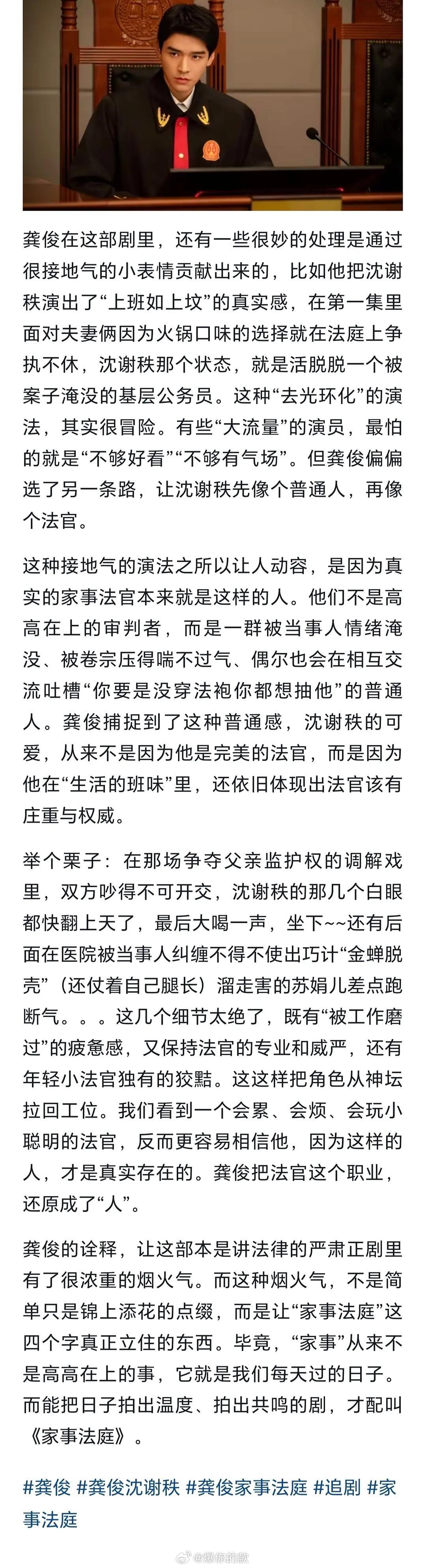 龚俊的演绎让我get到了家事法庭有“被工作磨过"的疲惫感,又保持法官的专业和威严,还有年轻小法官独有的狡黠。这这样把角色从神坛拉回工位。我们看到一个会累、会烦、会玩小聪明的法官,反而更容易相信他,因为这样的人,才是真实存在的。龚俊把法官这个职业,还原成了“人”。龚俊的诠释,让这部本是讲法律的严肃正剧里有了很浓重的烟火气,这种烟火气是让“家事法庭”这四个字真正立住的东西。毕竟,“家事”从来不是高高在上的事,它就是我们每天过的日子。而能把日子拍出温度、拍出共鸣的剧,才配叫《家事法庭》。说的太好了!就是这种感觉。看了暗河传苏暮雨就知道龚俊演技有点东西,他是真的很擅长塑造人物。
