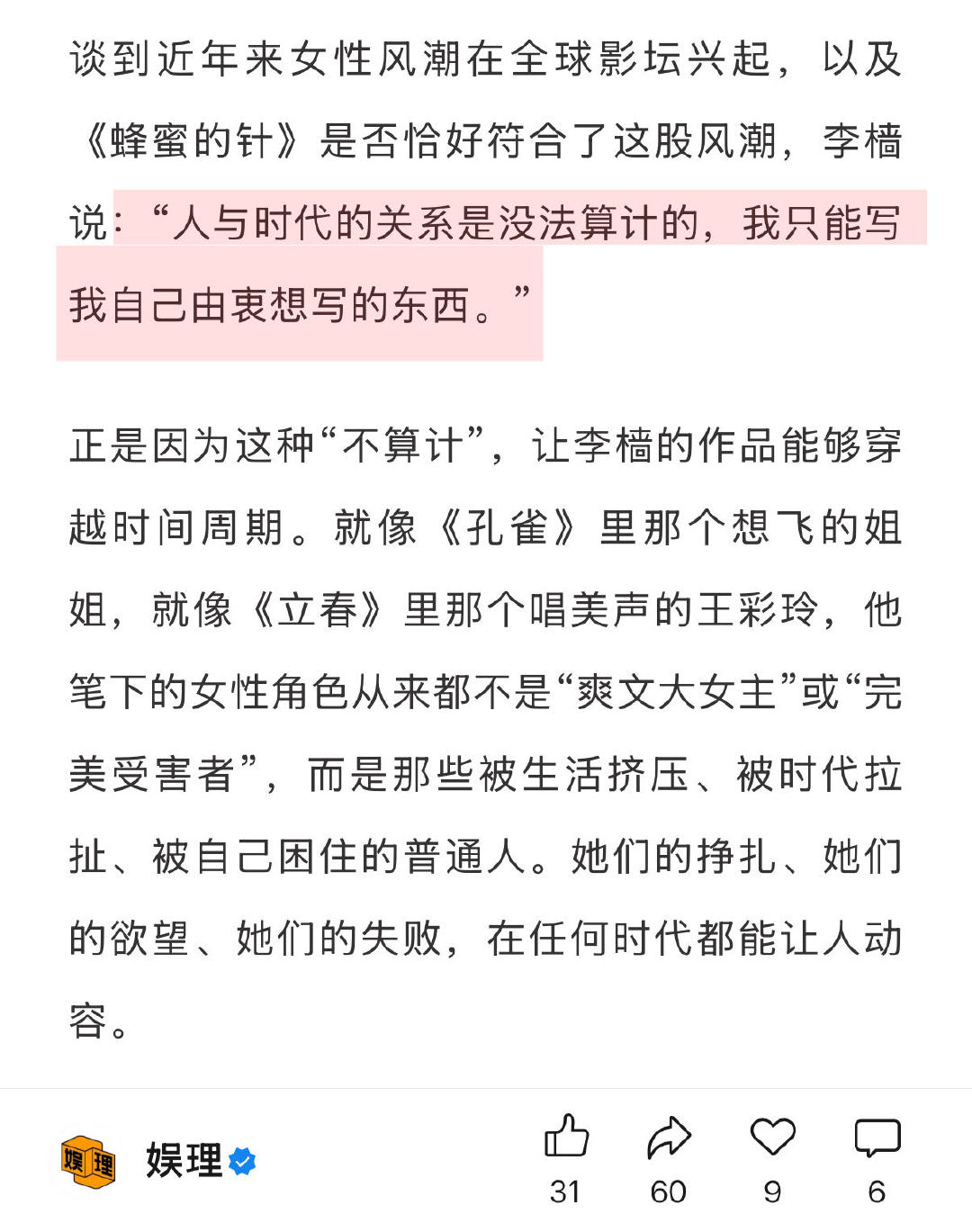 蜂蜜的针演员无人问戏份多少 《蜂蜜的针》演员阵容太豪华!袁泉、宁静、俞飞鸿、齐溪、陈冲、杨子姗、刘雅瑟、窦靖童…编剧李樯透露:“没有人问我有多少场戏。大家觉得这个故事、这个角色吸引她,自然而然就来了,没有乱七八糟的要求。" 李樯说蜂蜜的针是失而复得