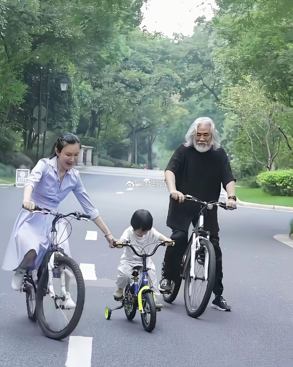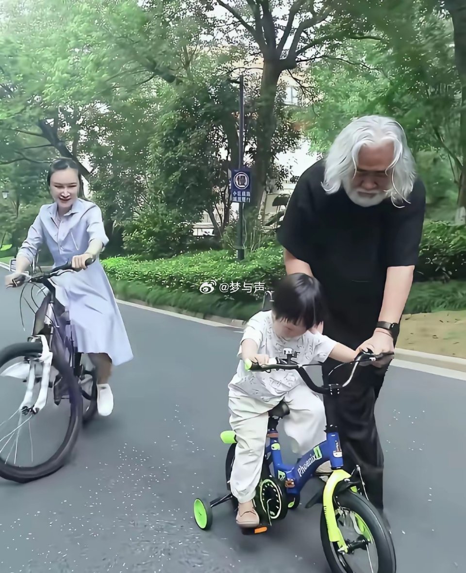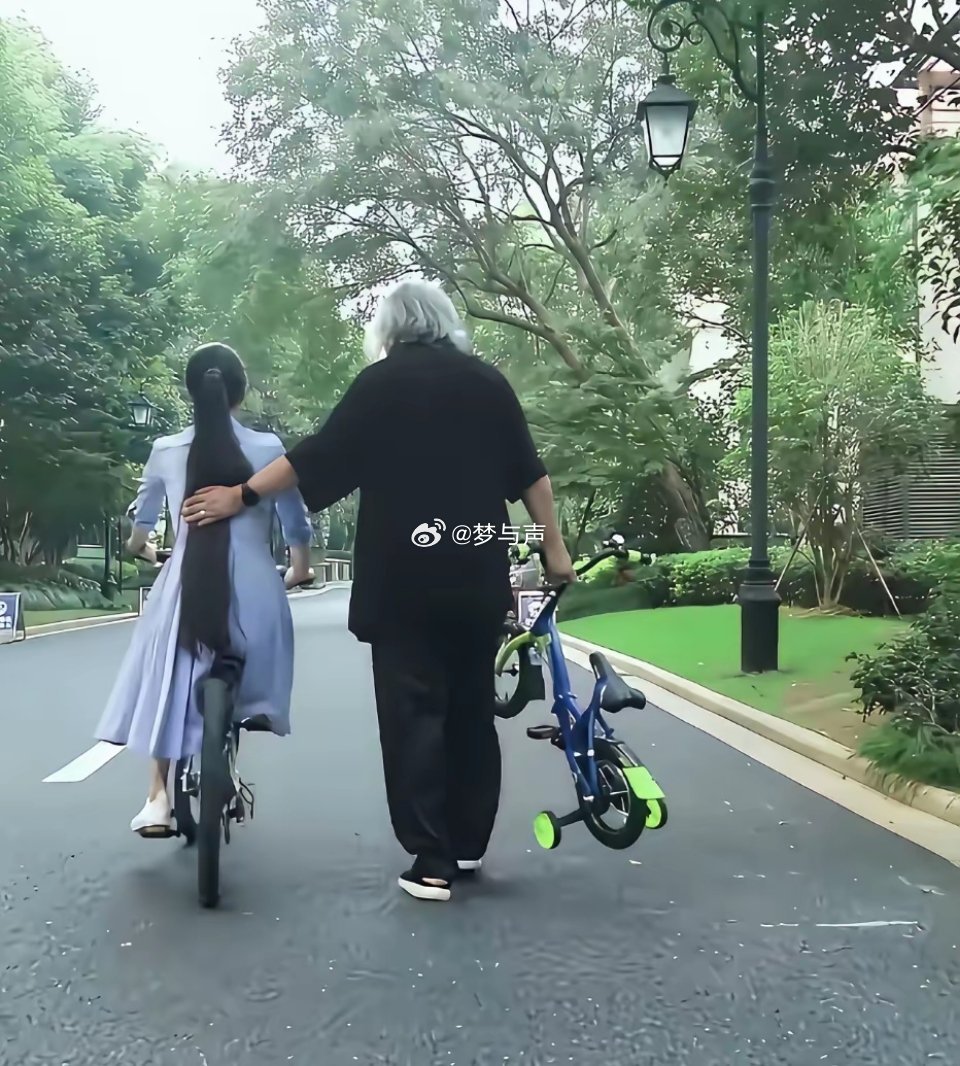 张纪中夫妇陪女儿骑自行车,女儿走在前面,夫妻二人左右保护,一家三口同框温馨又幸福。镜头下的张纪中穿黑色体恤搭配同色系裤子,一头白发,满脸春风看着女儿满眼都是宠爱。老婆身穿浅紫色连衣裙,扎着高马尾,跟在后面,女儿骑个小自行车,幸福的走在中间,一家三口同框画面好温馨。