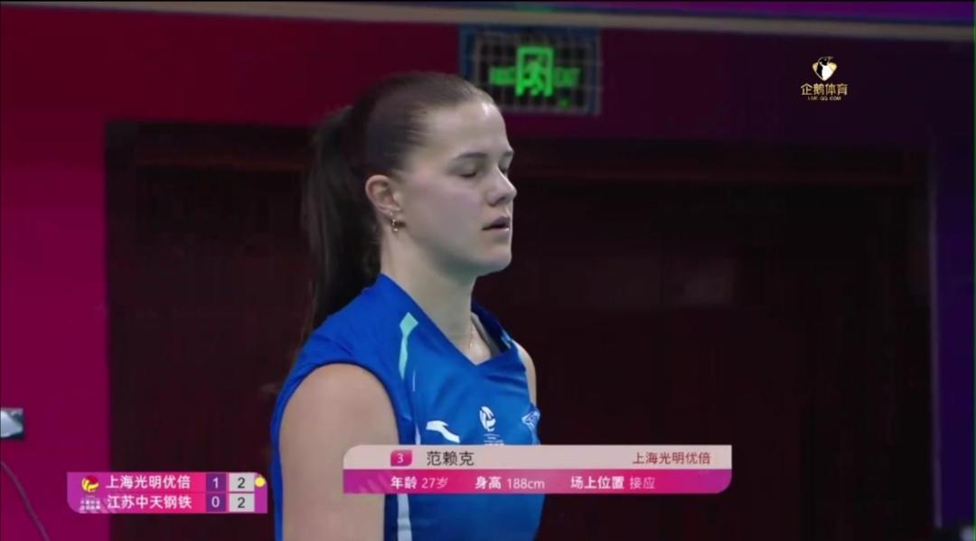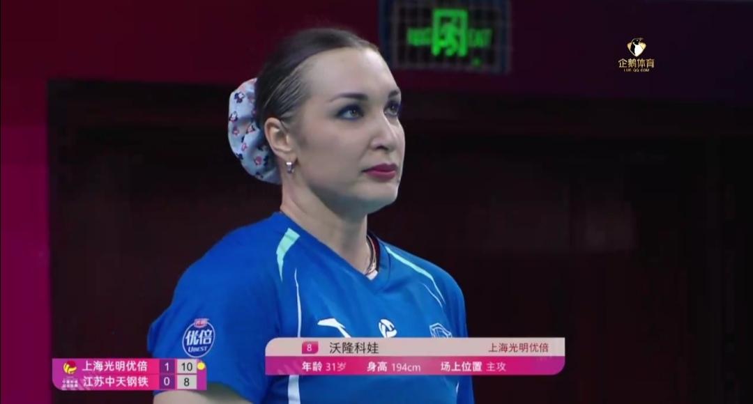 上海光明优倍还江苏中天钢铁一个3:0! 首发阵容双方心里都清楚,知根知底,如第一回合一样。 第二回合女排A级冠军争夺战,上海光明优倍主场同样还给江苏中天钢铁一个3:0(25-20;2523;25-15)! 第一回合,上海队客场0:3(16-25;16-25;20-25)完败于江苏队! 上海队从第一回吸取教训了,心理疏导比较好,尤其是俄罗斯主攻沃隆科娃不发脾气,有笑容了! 加拿大接应范赖克,大力跳发势大力沉,成功率高。另一主攻17号主攻今天发挥也比较好。 江苏队今天主要问题,发球攻击性弱,拦防4号位进攻不好,一传稳定性也不如第一回合。 第三局,上海队已换大自由人王唯漪,准备第三场比赛了! 局末阶段,上海队又换下3号范赖克、8号沃隆科娃、6号高意等主力队员。 好戏在明天,25年未尝冠军的上海队要夺冠! 去年联赛冠军、全运会冠军的双冠王江苏队要卫冕! 4月1日 上海光明优倍Vs江苏中天钢铁