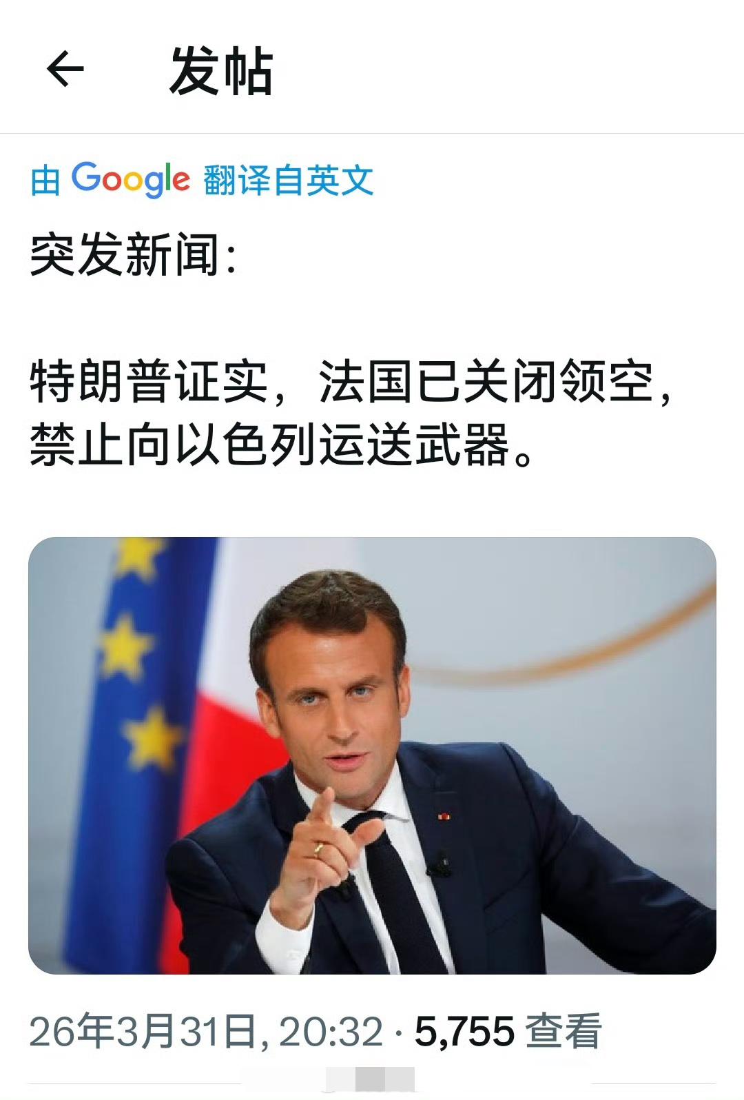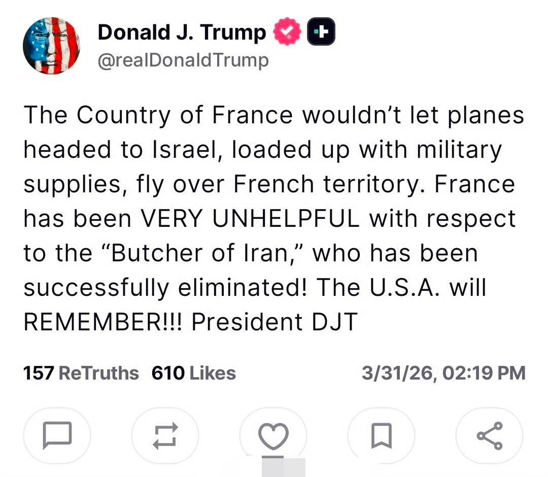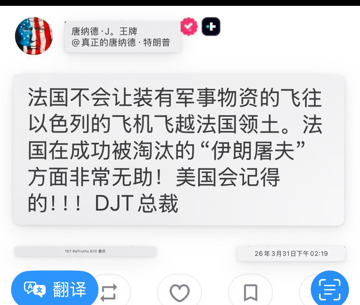 美国陷入了墙倒众人推的局面!特朗普表示:我记下了! 继西班牙、土耳其和意大利之后,如今法国也禁止美国军机在其领空飞行。 特朗普发帖抱怨道:“法国不愿协助美国,反而站到伊朗那边,实在令人失望,美国记下了。” 法国此次的决定,无疑给美国本就不顺利的军事行动增添了阻碍。以往美国凭借军事霸权,在全球肆意妄为,盟友纷纷前来相助,可如今却处处碰壁。 这让美国颜面扫地,国际形象严重受损。 在当前形势下,特朗普虽嘴上说记下了,但美国目前拿不出有效的反制措施。毕竟,若美国采取强硬手段报复,很可能会招致更多国家的反感。特朗普这是要为自己的傲慢鲁莽付出代价了!