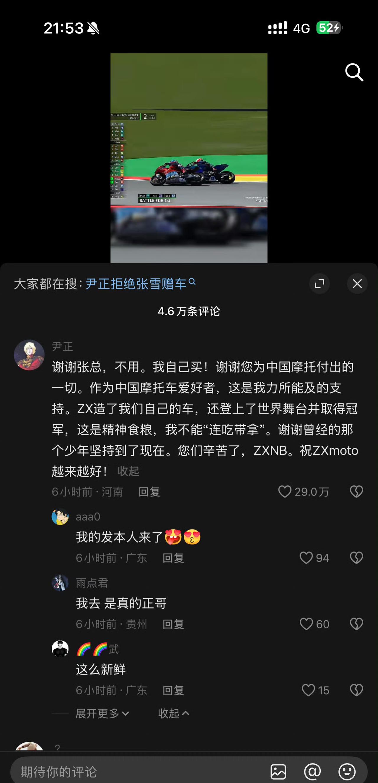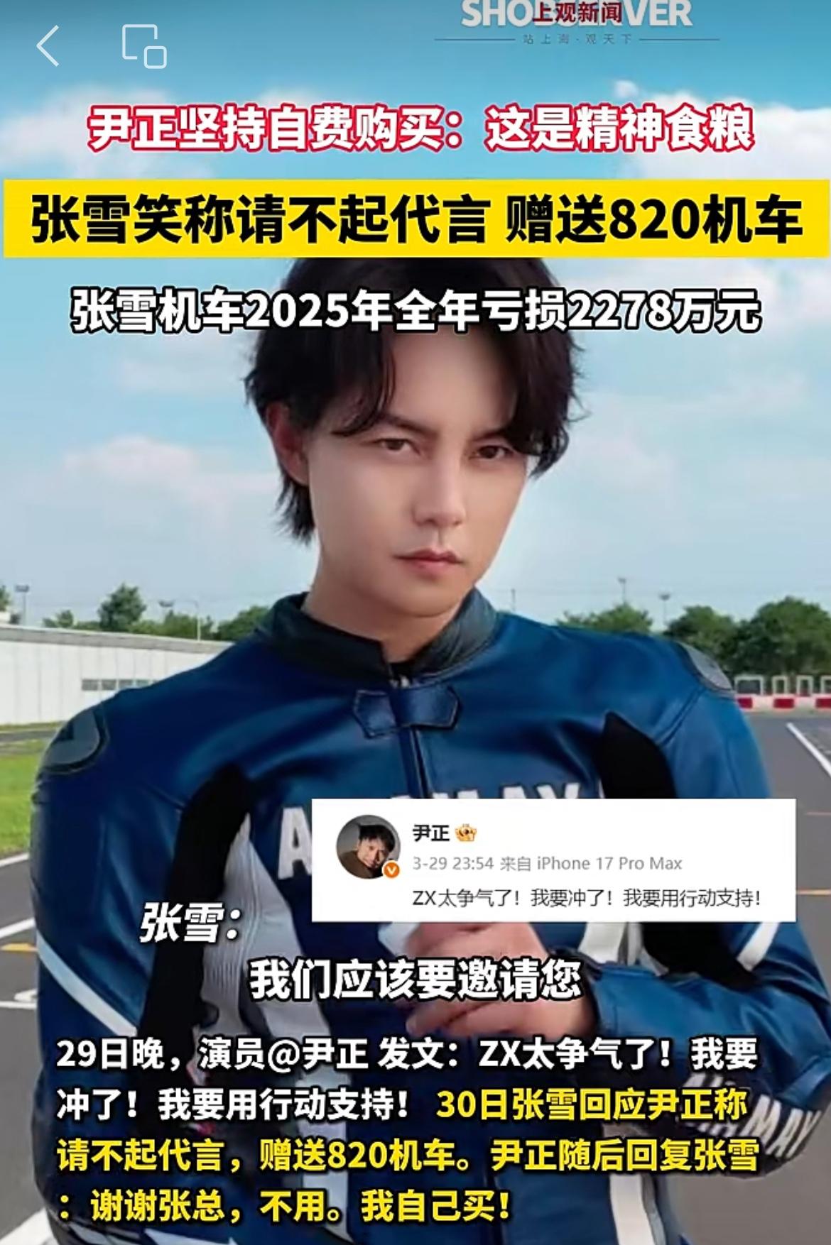 张雪说要给尹正送车,尹正婉言谢绝了,他说要用自己的钱买。听闻张雪的车在国际赛场夺冠,尹正替张雪感到高兴,亲自祝贺他,张雪一激动就想感谢尹正一直以来的支持。尹正是一名机车的爱好者,张雪提出给他送一辆夺冠的车辆,尹正说车就不用送了,他要用钱买,这才是对张雪执着的最好支持。尹正三观比较正,面对张雪的热情,尹正不蹭他的热度,也不占他的便宜,想花钱实打实的支持,这无疑是最走心的认可。