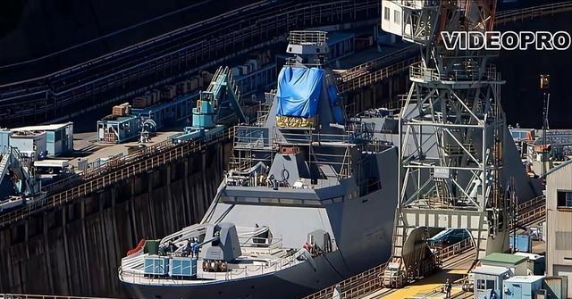 日本三菱长崎造船厂,造舰的干船坞繁忙的景象,“最上”级护卫舰的FFM9~12号舰