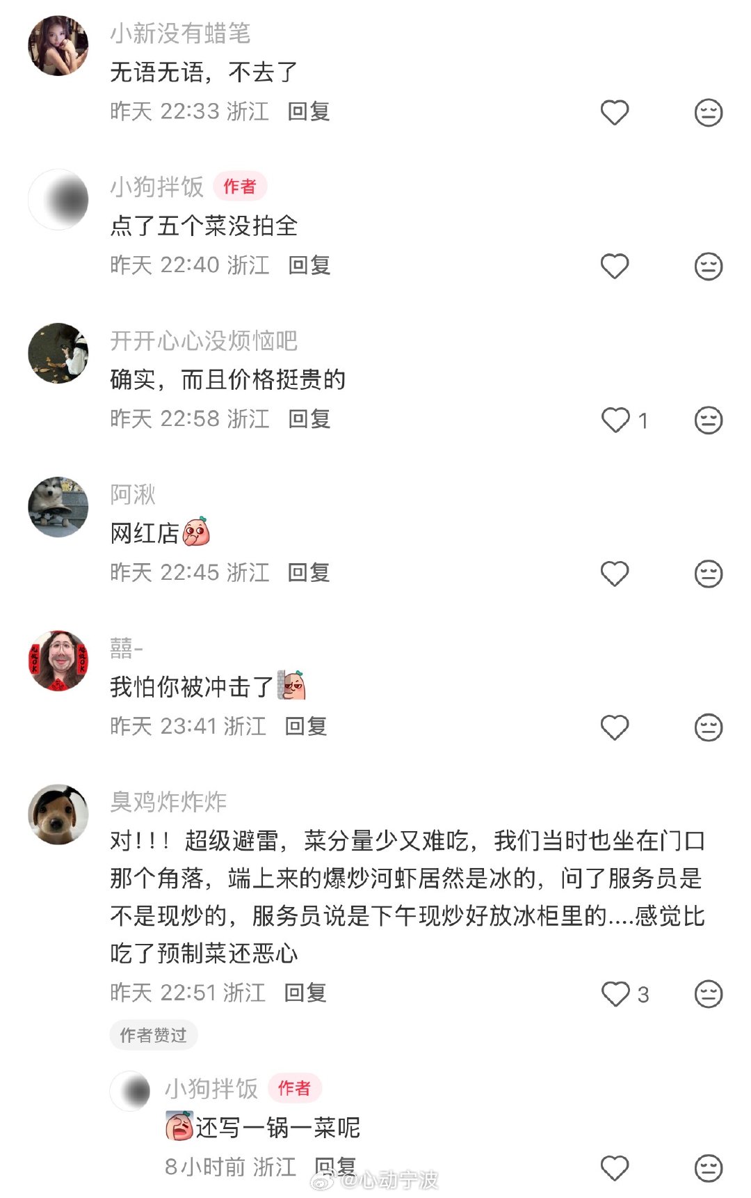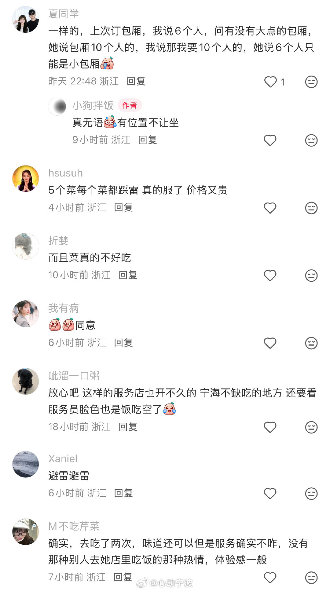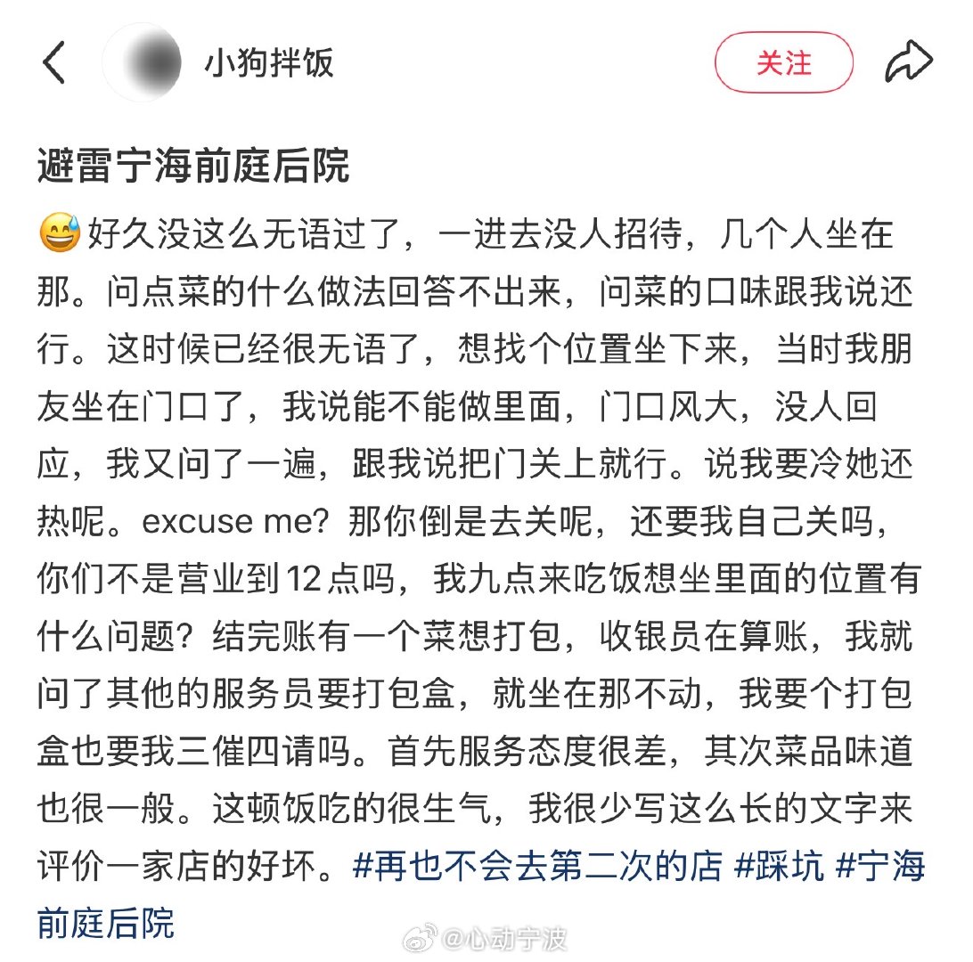【网友吐槽浙江宁海一餐厅服务与菜品双翻车 多名消费者现身避雷】近日,有网友在社交平台发文吐槽宁海“前庭后院”餐厅,称其用餐体验极差,引发众多网友共鸣。