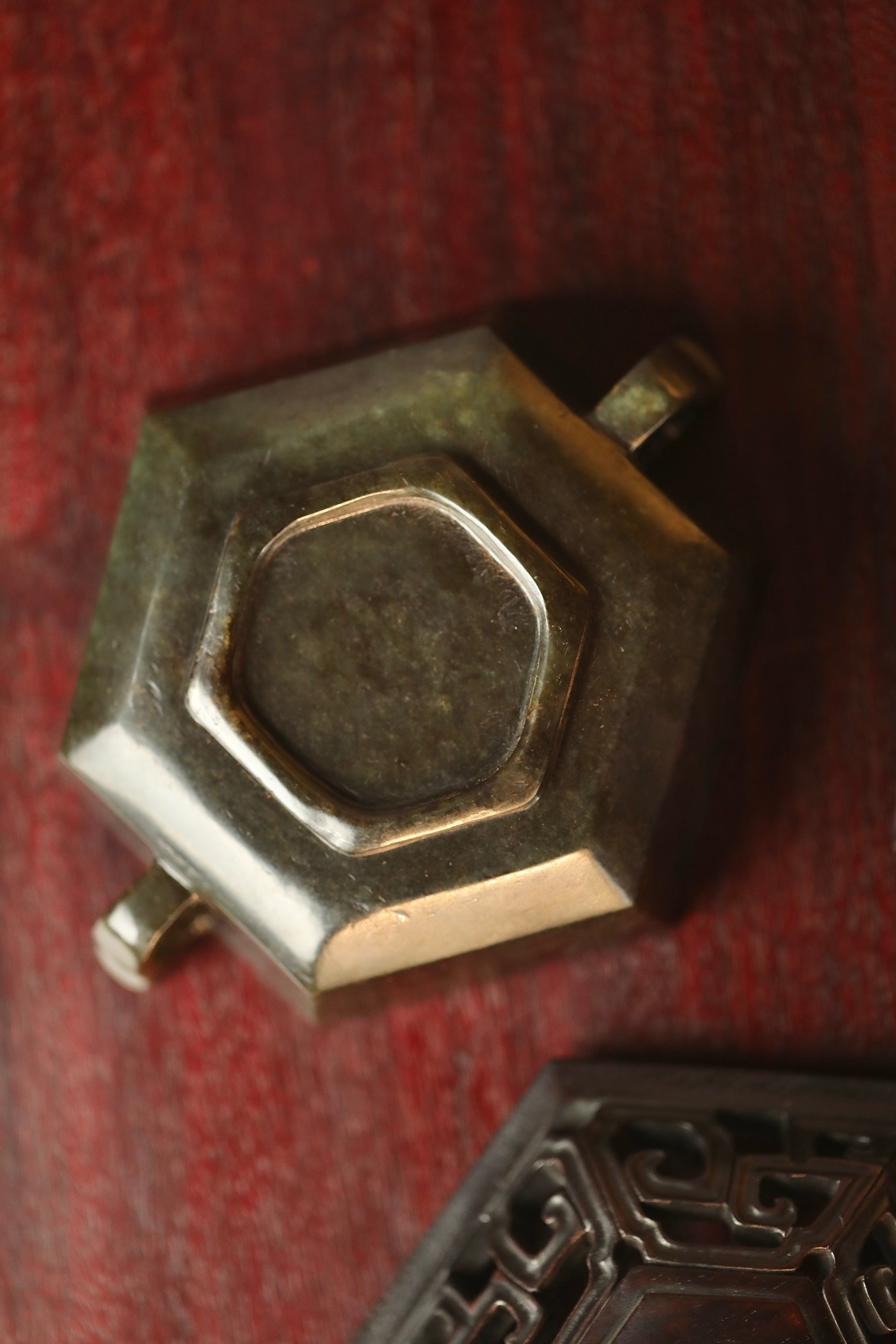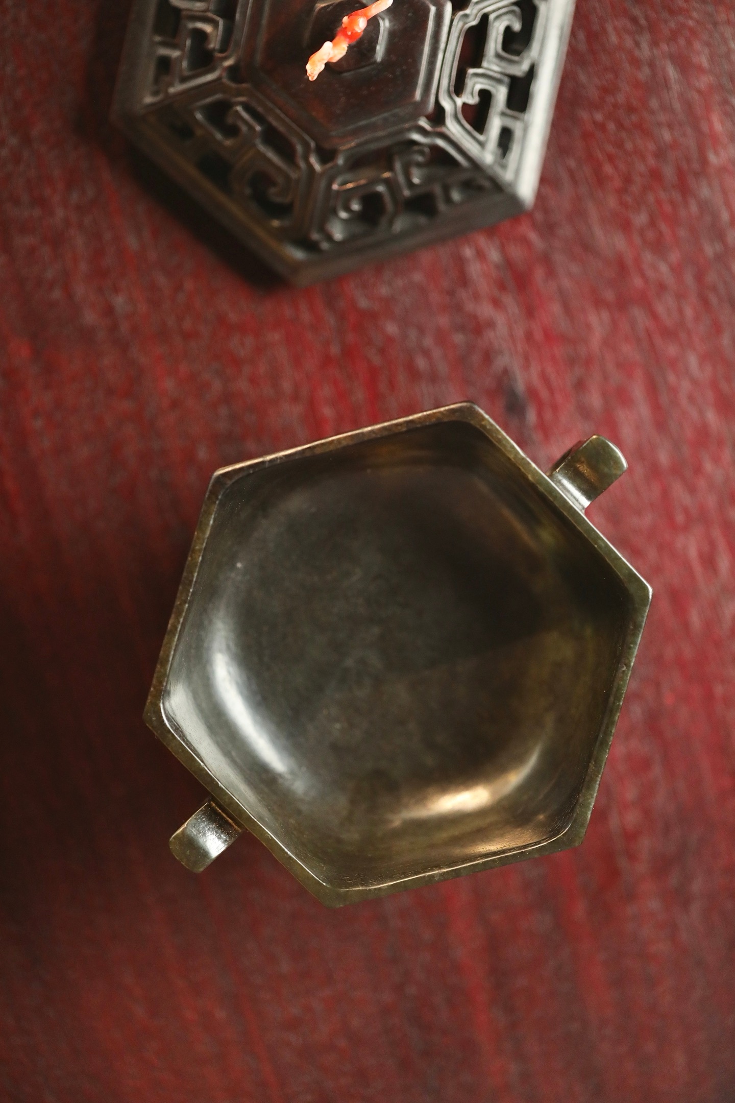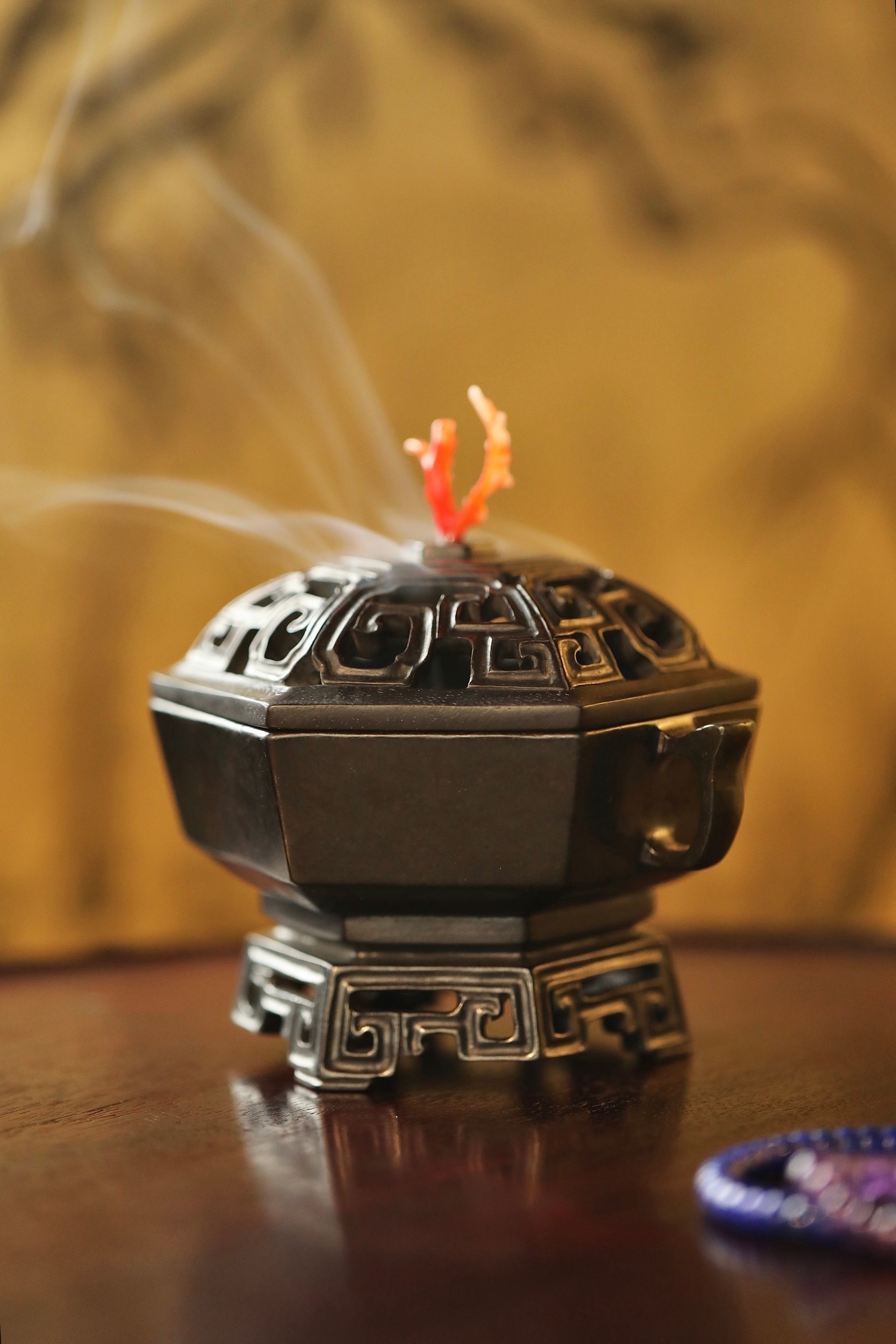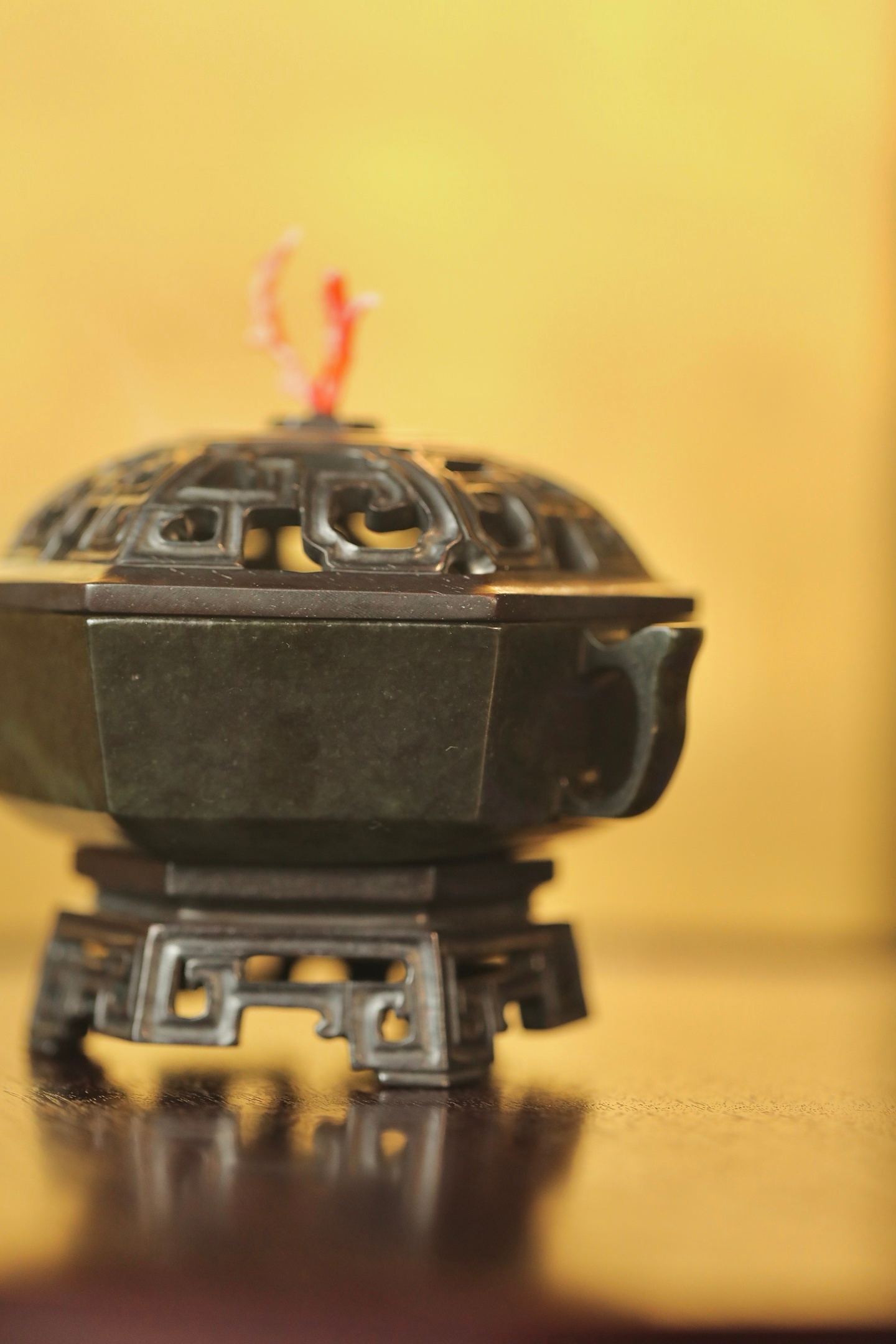 器型为六棱方炉,形制规整,线条刚劲挺括,古韵盎然。炉身两侧出双耳,造型简约大气,线条流畅利落;炉底承透雕回纹底座,回纹婉转,玲珑精巧,虚实相生。炉盖透雕回纹,出烟流畅,盖钮以天然俏色巧作,灵动雅致。置于书斋、茶室,既衬笔墨之雅,又添禅意之韵。