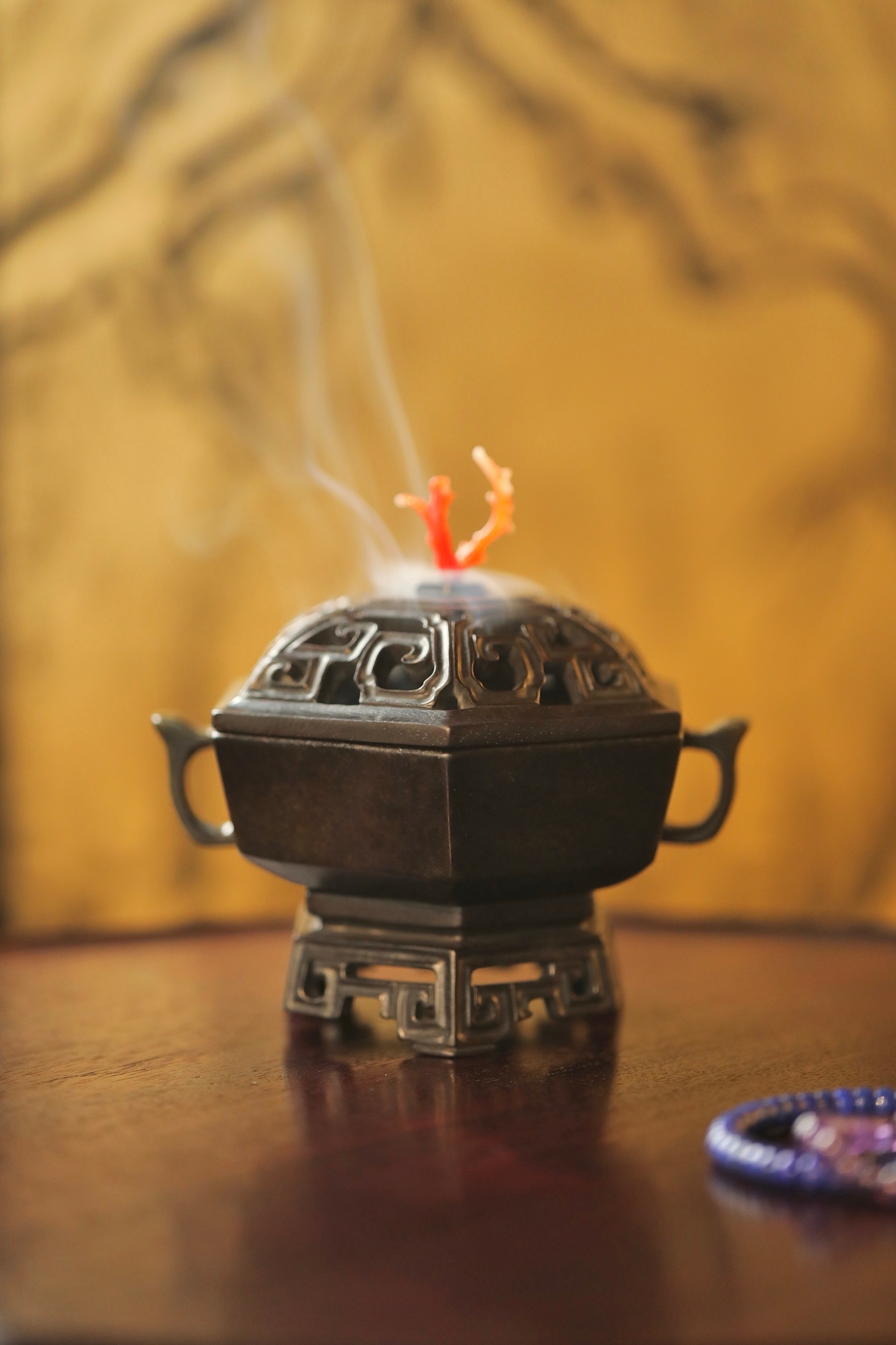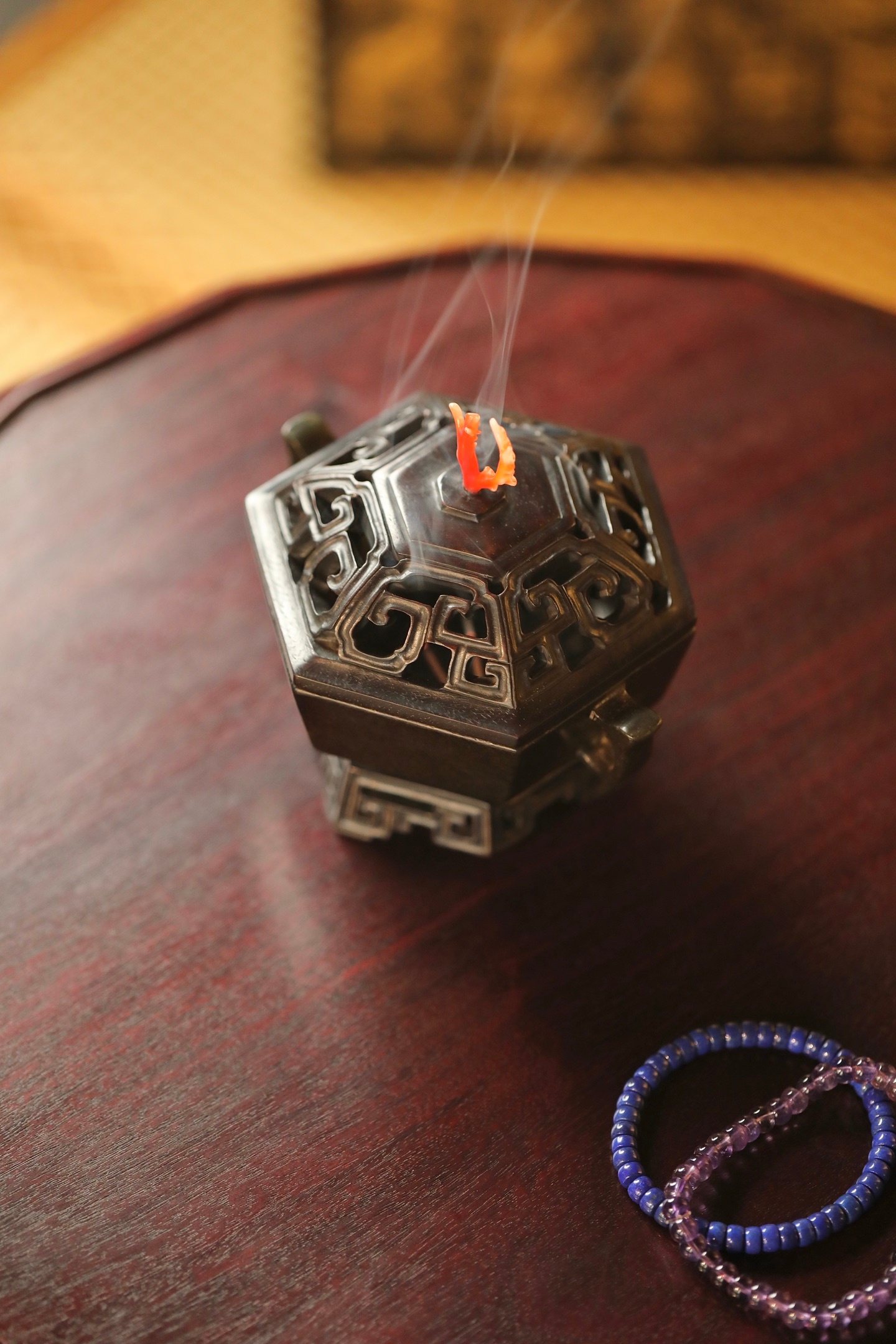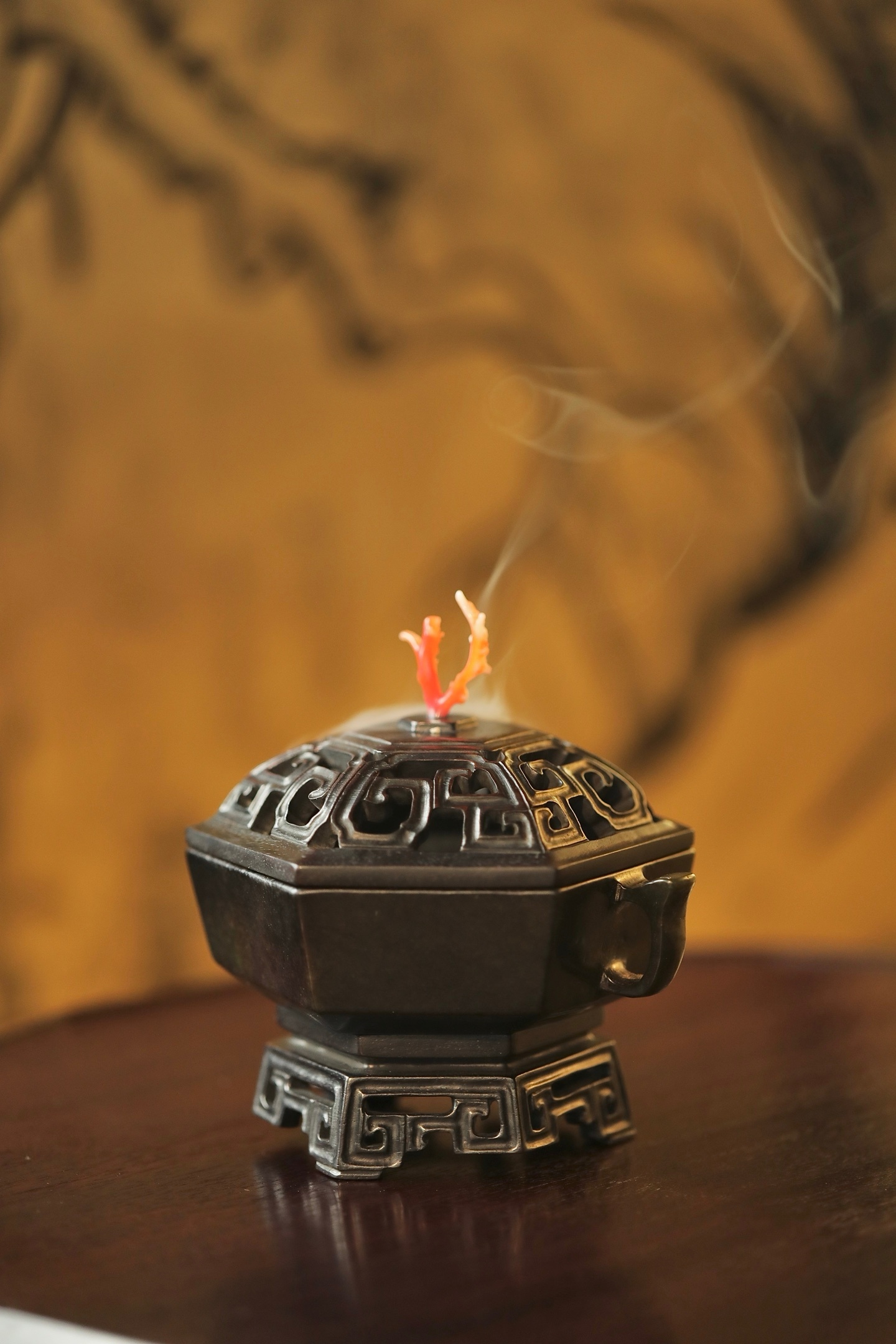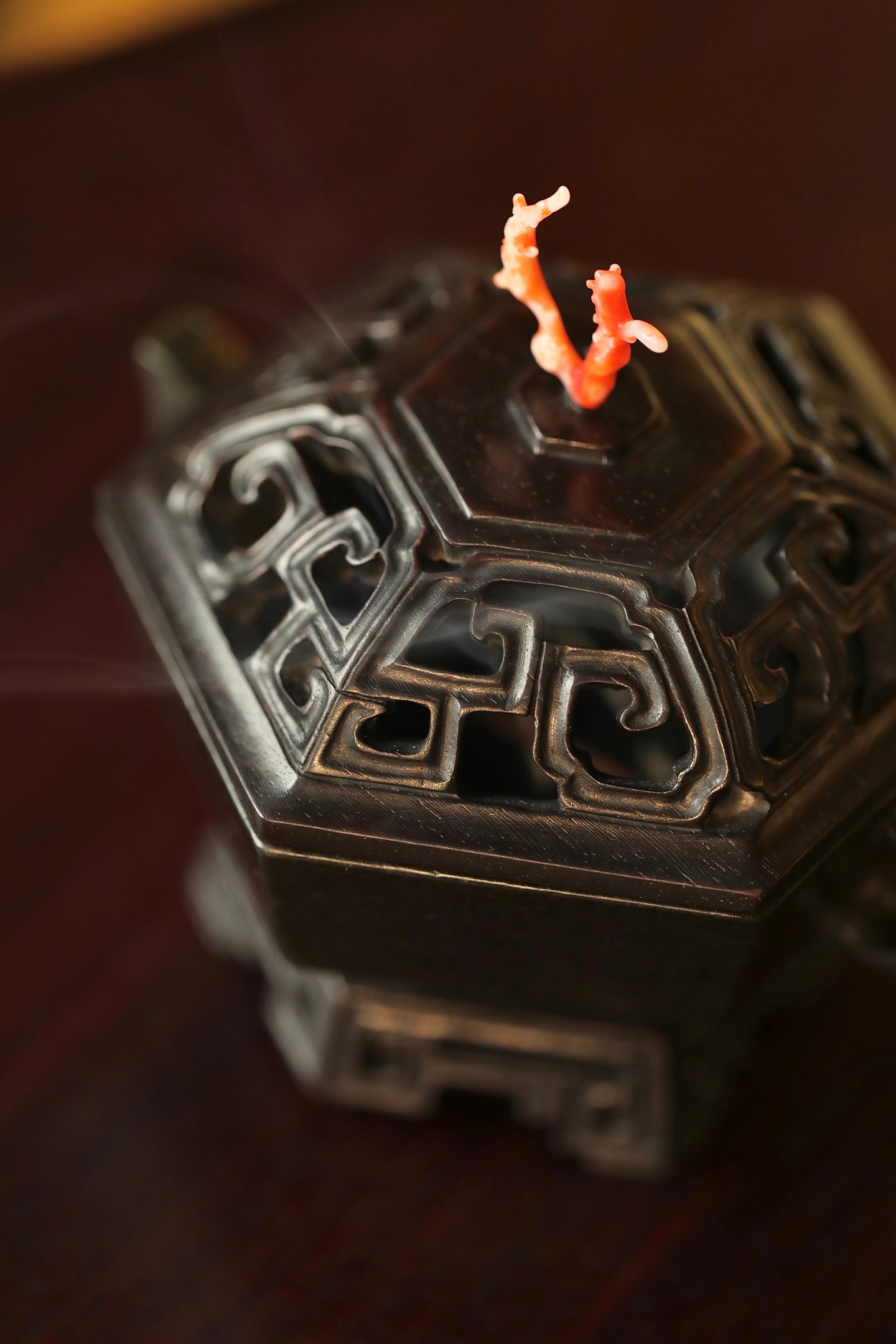 器型为六棱方炉,形制规整,线条刚劲挺括,古韵盎然。炉身两侧出双耳,造型简约大气,线条流畅利落;炉底承透雕回纹底座,回纹婉转,玲珑精巧,虚实相生。炉盖透雕回纹,出烟流畅,盖钮以天然俏色巧作,灵动雅致。置于书斋、茶室,既衬笔墨之雅,又添禅意之韵。