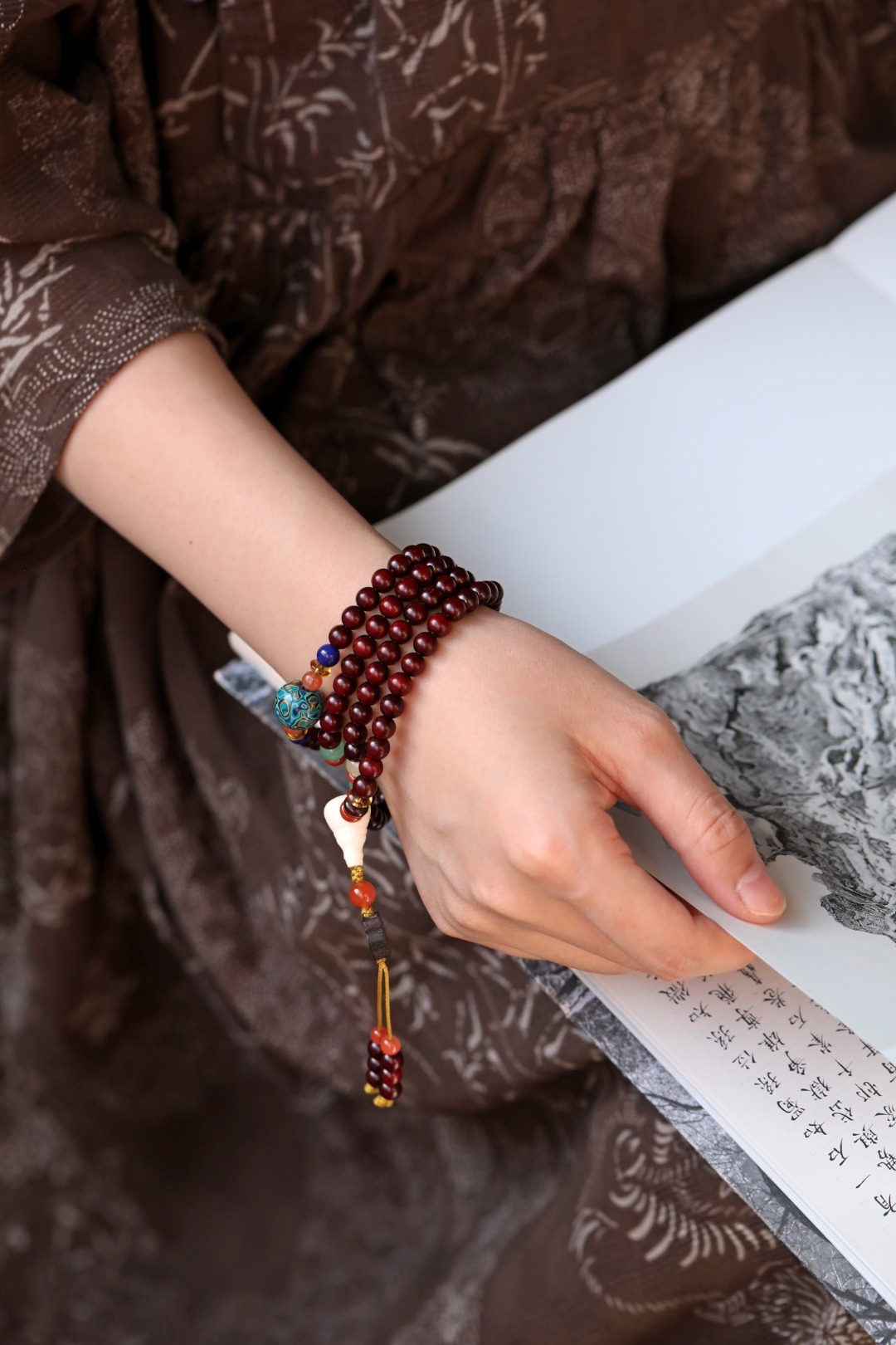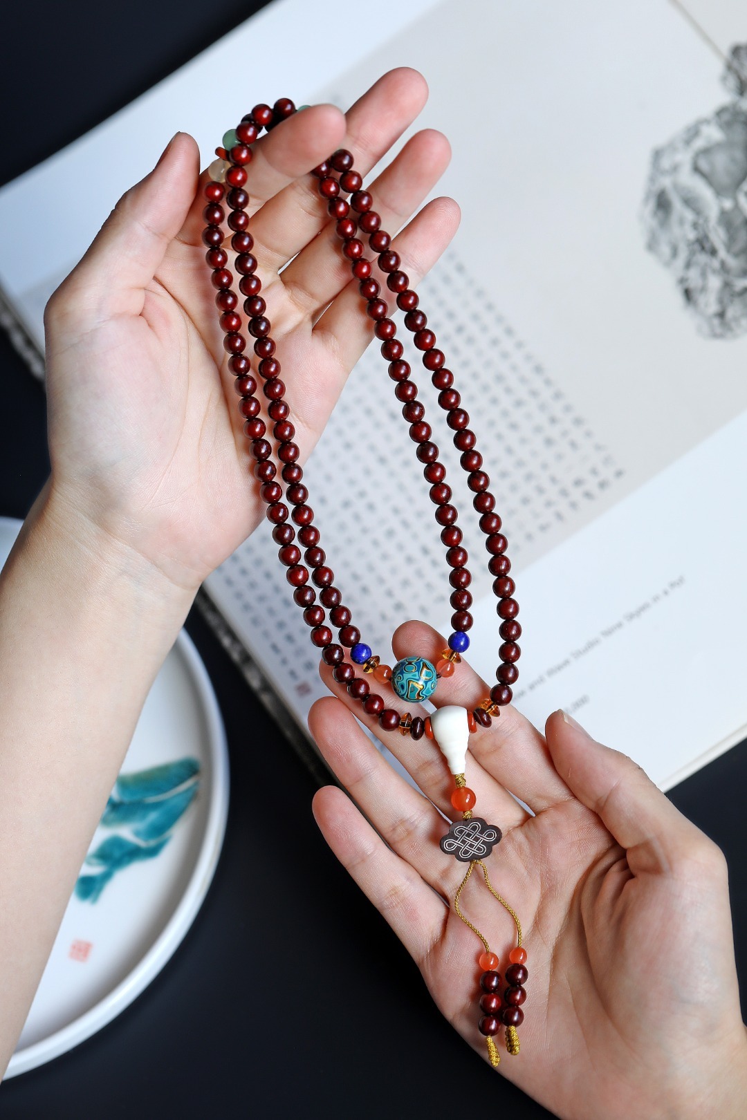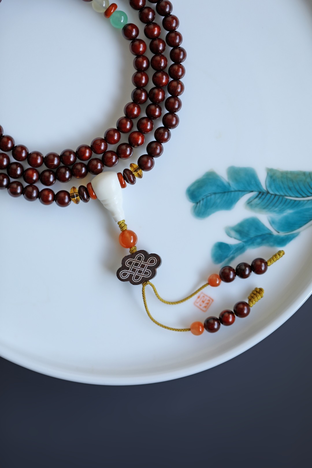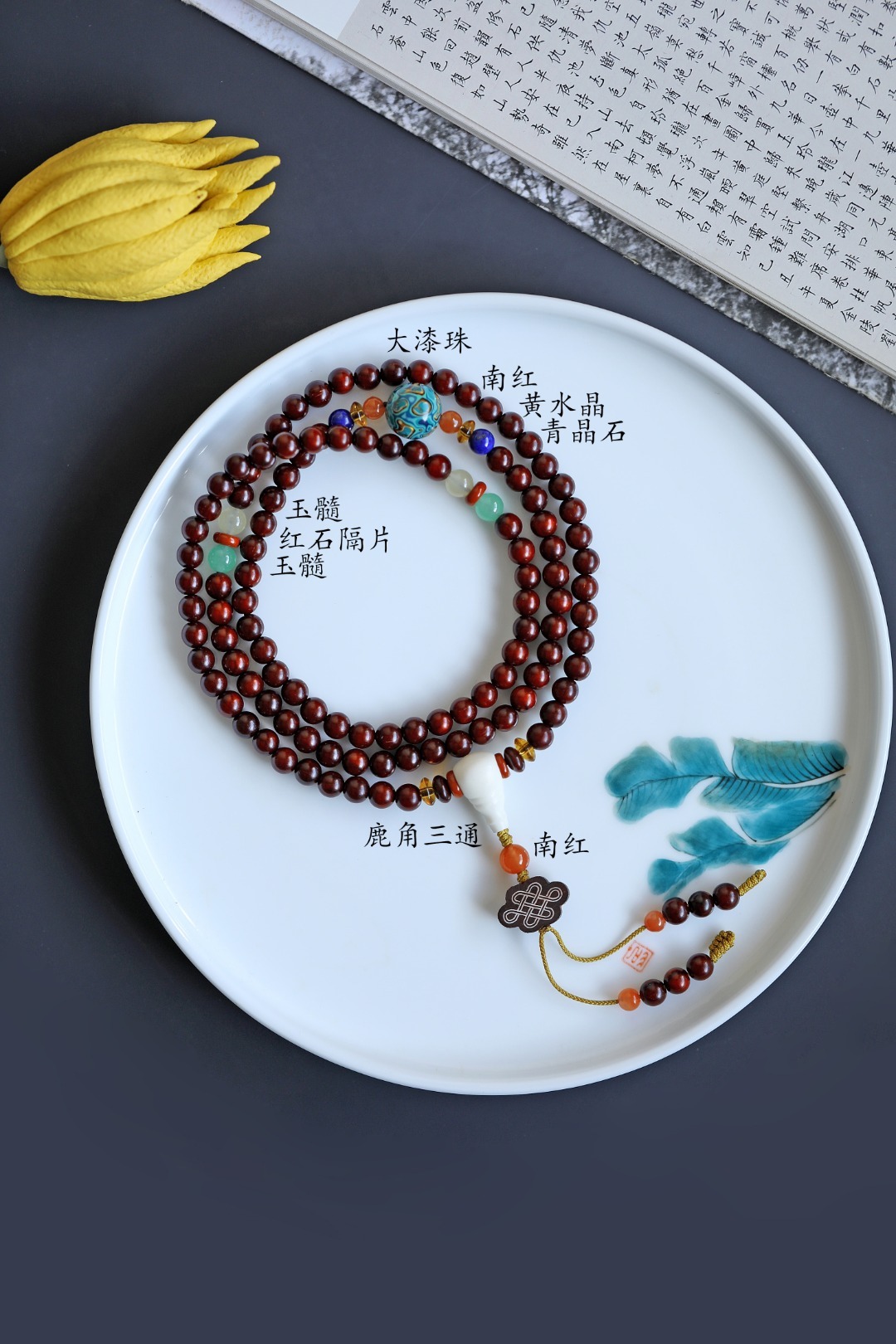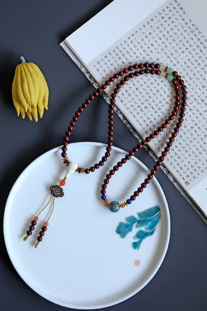 配饰:大漆珠、南红、黄水晶、青晶石、玉髓、红石隔片、鹿角三通 小叶紫檀原创【以风】6mm108颗