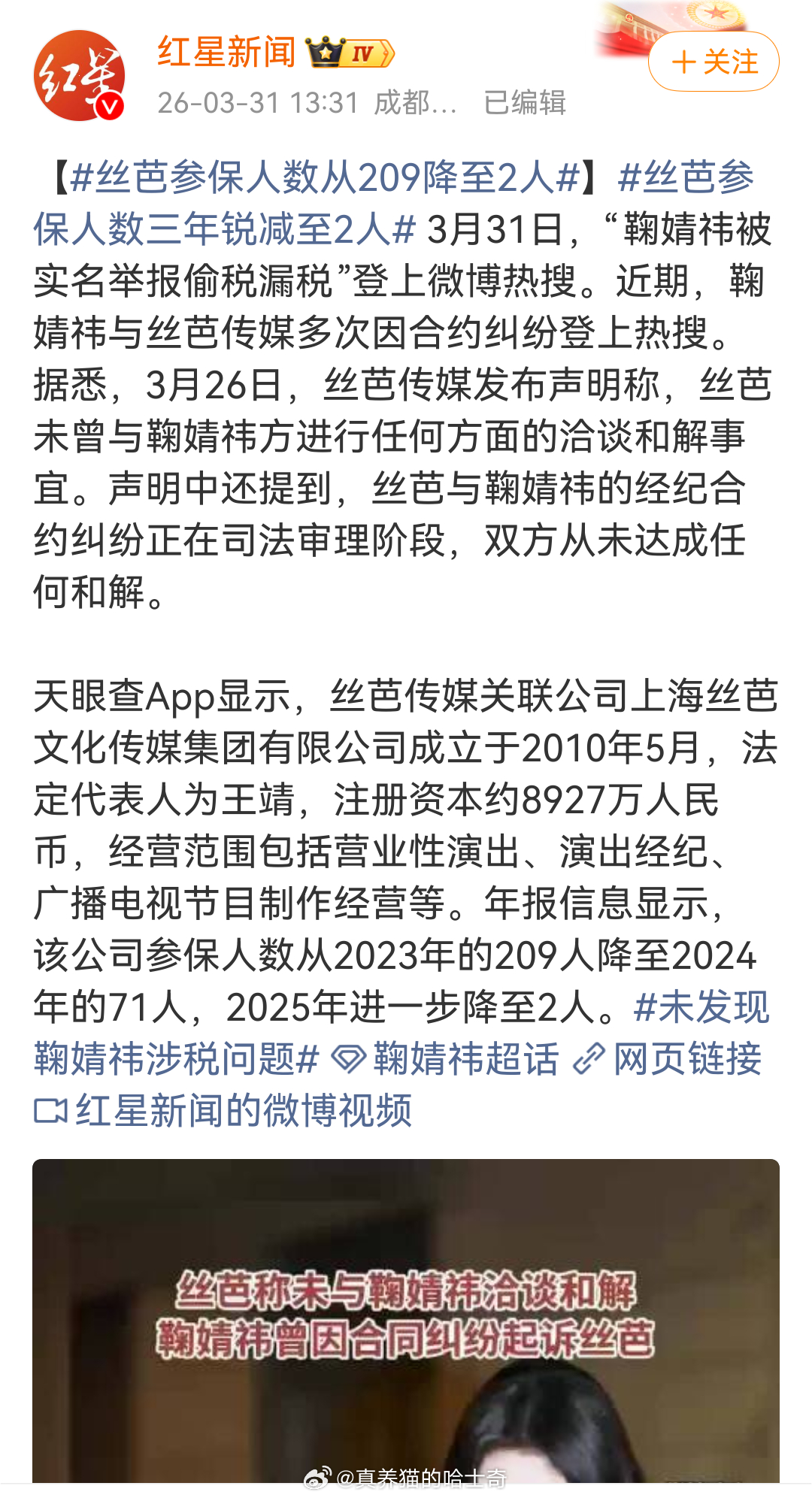 丝芭参保人数从209降至2人 这公司是不是不想干了,解约艺人不想付违约金啥的?