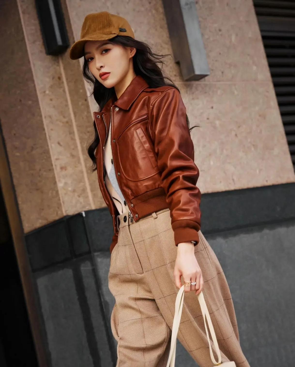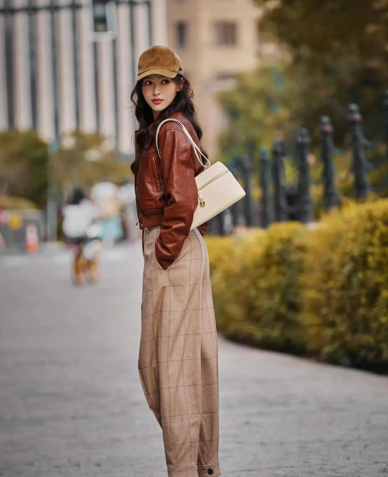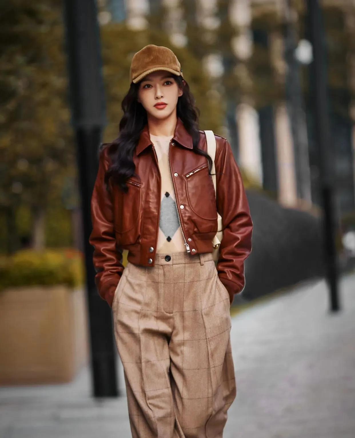 唐嫣这套美拉德穿搭直接封神!棕色短款皮衣+格纹阔腿裤,把秋日氛围感焊在身上了✨ 短款皮衣利落显高,格纹裤藏肉又松弛,同色系搭配高级感拉满,又飒又优雅,谁穿谁是街头女主角! 唐嫣 美拉德穿搭 秋日穿搭 皮衣穿搭