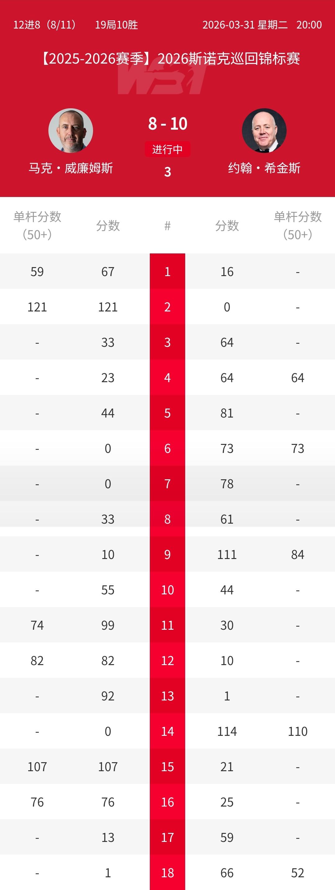 一觉醒来,发现今天是愚人节,吴宜泽跟我们开了一个大大的玩笑,第二阶段连输8局,最终无缘巡回锦标赛八强。 第一阶段:吴宜泽6-2领先韦克林 第二阶段:吴宜泽崩盘,这剧情似曾相识。最终6-10不敌韦克林。 隔壁的马威、希金斯鏖战18局,最终马威8-10不敌希金斯。 第一阶段:马威2-6希金斯 第二阶段:马威追到8-8,随后连丢两局,8-10负于希金斯。