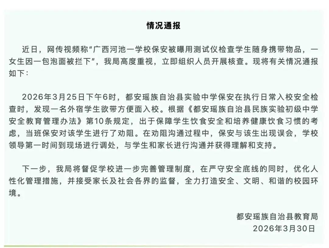 校门口随意搜身,一包方便面岂能成为越界理由? “必须严惩!”广西一实验中学校门口三名女学生结伴入校,一名男性保安直接将她们拦下,不仅手持检测仪对学生携带物品进行检查,还动手拉扯女生衣角、检查衣兜随意搜身,一番检查后,仅从一名女生身上搜出一包方便面…… 看到这一幕,真的让人又气愤又心寒。 这可是十几岁的女学生,正处在敏感又自尊的年纪, 被异性保安当众拉扯衣角、随意搜身,心里该有多委屈多难堪? 学校设置安检、规范学生入校携带物品,初衷本是好的。 无非是怕学生带零食、危险品进校园,影响校园秩序和饮食健康, 可再好的初衷,也不能成为践踏学生尊严、触碰法律红线的借口。 一包方便面,说到底只是普通的食品,就算违反了学校的零食禁令, 顶多是提醒、没收,再跟学生好好沟通教育,根本犯不上用搜身这种极端方式。 保安的做法,完全是把管理的权力用错了地方,更是越过了基本的底线。 要知道,我国法律明确规定,除了执法机关,任何人都没有随意搜身的权利。 尤其是异性之间,当众对未成年女学生进行身体接触式检查, 不仅侵犯了学生的人身自由权,更严重伤害了她们的人格尊严和心理健康。 青春期的孩子,自尊心极强,这种当众被搜身的经历, 很可能会给她们留下长久的心理阴影,甚至对校园、对他人产生抵触情绪。 学校是教书育人的地方,本该是保护孩子、尊重孩子的港湾, 可这样的行为,反倒成了伤害孩子的利刃,实在让人难以接受。 再说学校的管理方式,也太简单粗暴了。 禁止学生带零食入校,完全可以通过班会、家校沟通、日常提醒来引导, 也可以安排工作人员用合规的方式检查物品,而非让异性保安动手搜身。 管理不是一刀切,更不是用强权压制,而是要带着温度和尊重去执行。 保安或许是觉得自己在履行职责,可他忘了,职责的前提是守法和尊重。 没有边界的履职,就是侵权;没有温度的管理,就是伤害。 学校也难辞其咎,平日里没有对保安做好培训,没有明确安检的边界和尺度, 才会出现这种荒唐又过分的行为,让学校的形象大打折扣。 这件事也给所有学校敲响了警钟,校园管理绝不能漠视学生的基本权利。 未成年学生,尤其是女生,更需要被保护、被尊重, 任何管理措施,都要在法律和道德的框架内进行,都要顾及孩子的心理感受。 不能打着“为学生好”的旗号,行伤害学生之实, 更不能让本该守护校园安全的保安,变成伤害学生尊严的人。 涉事学校必须正视问题,严肃处理涉事保安,同时整改不合理的安检制度, 给这三名女生一个诚恳的道歉,也给所有家长和学生一个交代。 校园管理,从来都不是靠强硬的手段,而是靠用心的引导。 尊重每一个学生的人格,守住法律和道德的底线, 才能让校园真正成为孩子安心学习、快乐成长的地方。 这种随意搜身的行为,绝不能姑息,必须严肃追责, 才能避免类似的荒唐事再次发生。 各位读者你们怎么看?欢迎在评论区讨论。