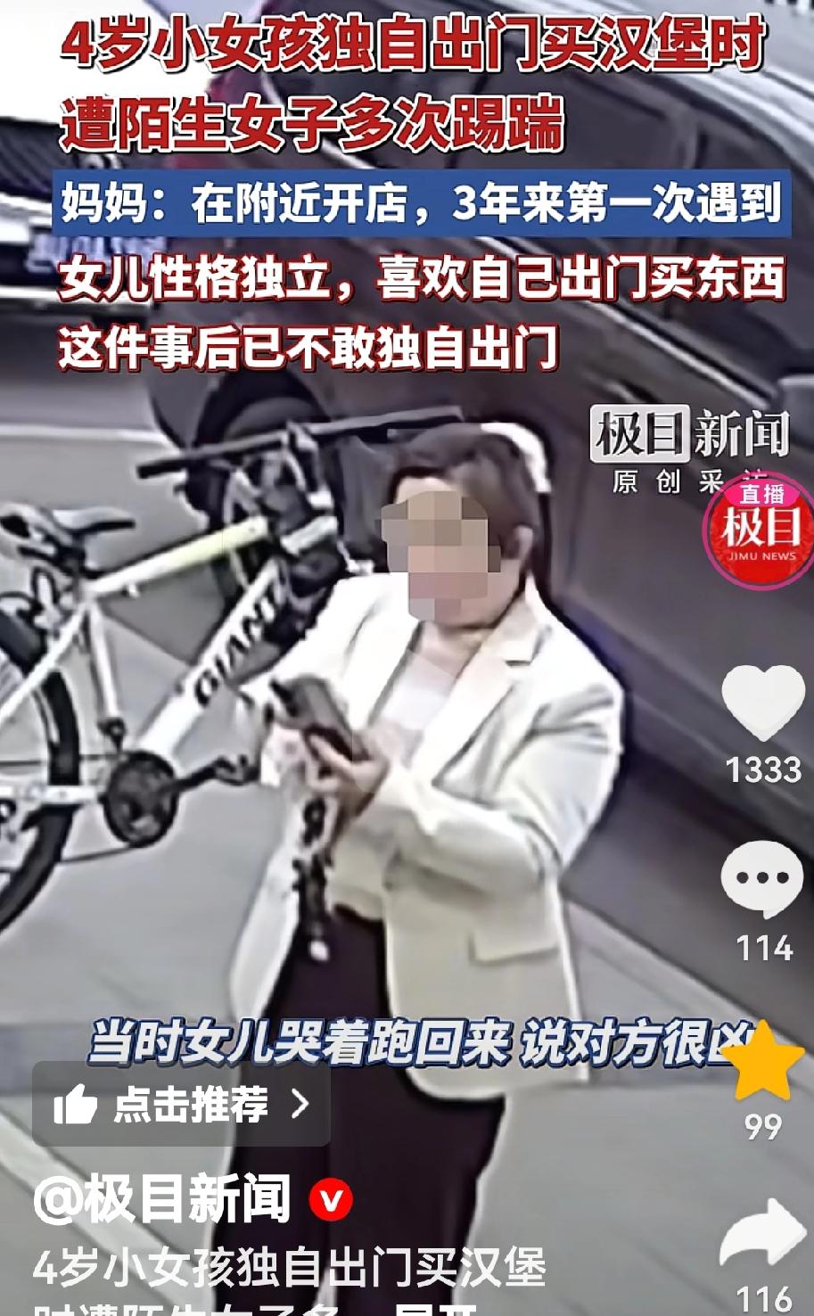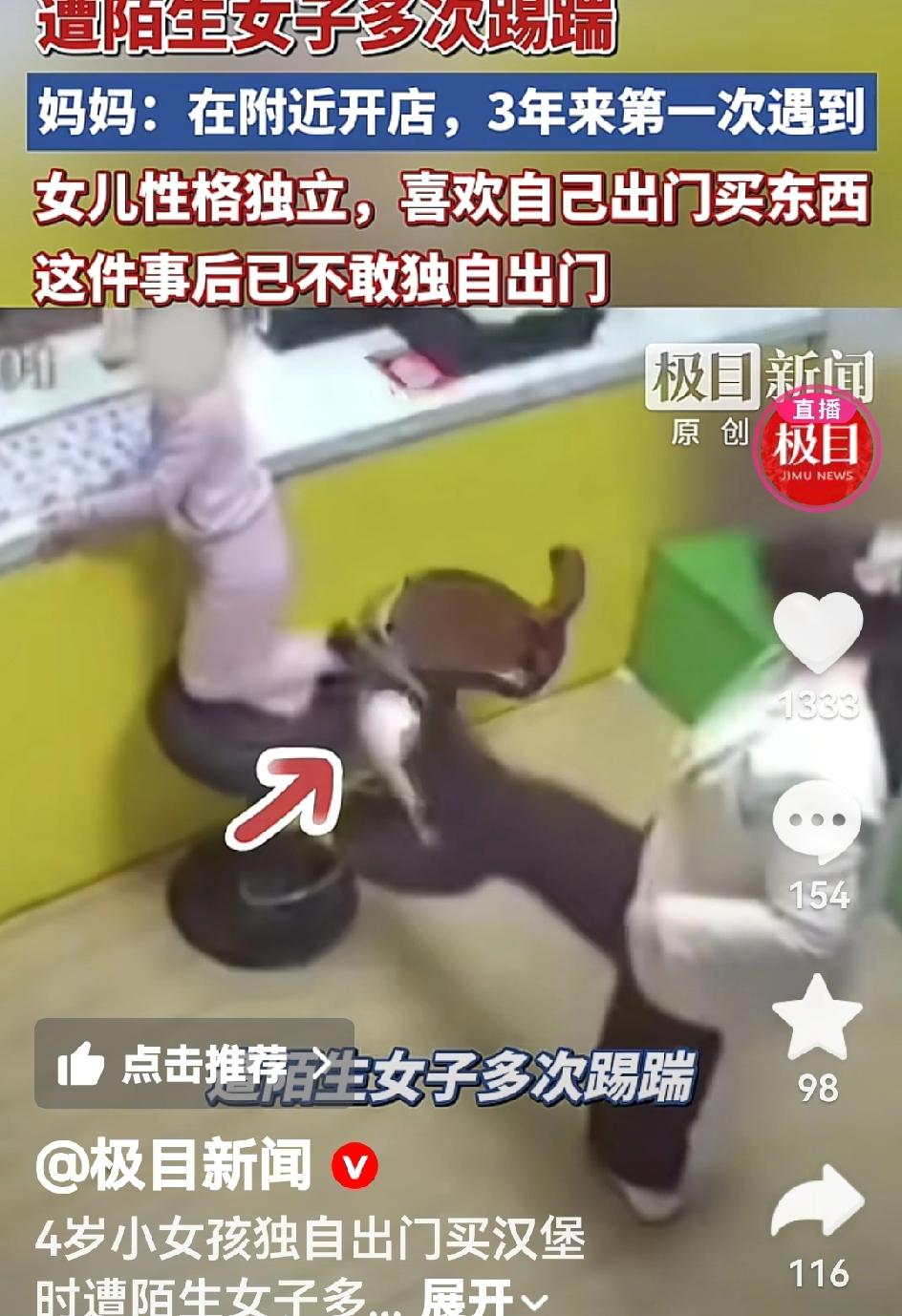 “天生坏种!”河南,一4岁小女孩在汉堡店买东西,可没想到,一女子路过时,竟对小女孩接二连三地连踢带踹,小女孩一路哭跑回家:“女子很凶,别找她!”店铺拒绝回应。网友:严惩不贷! 3月29日晚,一家汉堡店里,灯光明亮,来往的顾客不算多,一切都显得平和正常。 一个扎着小辫的4岁小女孩,凭着自己的小勇气,独自走进这家熟悉的汉堡店,想要买一份心仪的汉堡。 她熟练地走到吧台前,跪在圆凳上,安安静静地趴着等待出餐,没有吵闹,没有顽皮,全程乖巧得让人心疼。 就在这份安静被打破的瞬间,一名身穿白外套的女子带着自家孩子走进了汉堡店。 谁也没有想到,这个刚刚还温柔地帮自家孩子整理好鞋子的女人,转头看到独自等待的小女孩时,脸上的温柔瞬间褪去,取而代之的是令人费解的凶狠。 她没有任何犹豫,也没有任何言语交流,径直走到小女孩身边,抬起脚就朝着孩子踹了过去。 这一脚来得突然又凶狠,小女孩毫无防备,身子猛地往前栽了一下,疼得眼眶发红,却没敢大声哭出来,只是默默忍着委屈。 可施暴女子并没有就此停手,抬脚还想再次踢向小女孩,就在这时,汉堡店的老板走了出来,女子才暂时收敛了动作,装作若无其事的样子。 本以为这场无端的欺凌会就此结束,可老板转身走进后厨忙活后,女子又立刻露出了狰狞的面目,再次狠狠抬起脚,踹在了小女孩的屁股上。 这一脚力度极大,小女孩被踢得左右晃动,再也忍不住,当场哇哇大哭起来,那种恐惧和疼痛,顺着哭声蔓延开来。 哭着哭着,小女孩再也不敢停留,连滚带爬地从汉堡店跑了出去,一路朝着隔壁的店铺奔去——那里是她妈妈邱女士经营的小店。 邱女士在这片区域经营店铺已经三年多,平日里女儿性格乖巧又独立,经常自己独自来附近买零食、买汉堡,三年多来从未发生过任何意外。 那天晚上,她突然听到女儿撕心裂肺的哭声,心里一紧,立刻冲了出去,刚好看到女儿哭着跑过来,扑进自己怀里,浑身发抖地哭喊着:“女子很凶,别找她!” 看着女儿恐惧的模样,邱女士又心疼又气愤,她安抚好女儿后,立刻带着家人偷偷前往那家汉堡店,想要找到施暴女子讨个说法,可此时那名白衣女子早已带着自己的孩子离开了现场,只留下满心委屈的孩子和愤怒的家人。 邱女士没有放弃,第二天一早就赶到汉堡店,要求调取事发时的监控录像,拿到完整的监控后,她第一时间前往辖区派出所报了警,警方很快正式受理了这起案件,全力开展调查取证工作。 监控画面清晰地记录下了全过程,画面中可以清楚地看到,小女孩与那名白衣女子及其随行的孩子之间,没有任何肢体冲突,没有任何争吵磕碰,女子的踢踹行为,完全是无端发起的。 更令人气愤的是,当邱女士和警方试图向汉堡店老板了解事发时的更多细节,希望得到店铺的配合时,汉堡店老板却选择了沉默,对整个事件拒绝回应,既不说明当时的情况,也不提供更多协助。 事件很快被网友发布到网上,视频一经曝光,立刻引发了全网热议。 无数网友被这无端的恶行激怒,纷纷怒斥那名白衣女子是天生的坏种,丧心病狂,竟然对一个毫无反抗能力的4岁稚童下此毒手,这样的恶人必须受到法律的严惩,付出应有的代价。 也有部分网友提及,家长让4岁孩子独自出门,确实存在监护上的疏忽,但更多人表示,监护疏忽绝不能成为施暴者脱罪的理由,更不能成为指责受害者的借口。 4岁小女孩独自出门买东西,是她的独立和勇敢,不该成为被欺凌的理由; 白衣女子的无端施暴,是人性的扭曲和恶毒,理应受到最严厉的谴责和法律的制裁; 而汉堡店老板的沉默,则是责任的缺失,作为事发地的经营者,守护现场安全、配合调查,是其不可推卸的责任,沉默只会助长恶行,寒了人心。 一个4岁的孩子,只是想安安静静买一份汉堡,却无端遭到接二连三的踢踹,哭着跑回家哀求家人别去找施暴者,而事发店铺的冷漠沉默,更让这场恶行多了一份令人心寒的底色。 目前,警方还在全力调查此事,不少热心网友看到视频后,主动联系邱女士提供施暴女子的相关线索,这些线索也已同步交给办案民警,正在逐一核实。 我们始终相信,正义不会缺席,施暴者终将被找到,受到应有的惩罚,也希望这个受到惊吓的小女孩,能够早日走出心理阴影,重新变得活泼开朗,敢于再次独自走出家门,不再被恐惧笼罩。 如果各位看官老爷们已经选择阅读了此文,麻烦您点一下关注,既方便您进行讨论和分享,又能给带来不一样的参与感,感谢各位看官老爷们的支持!