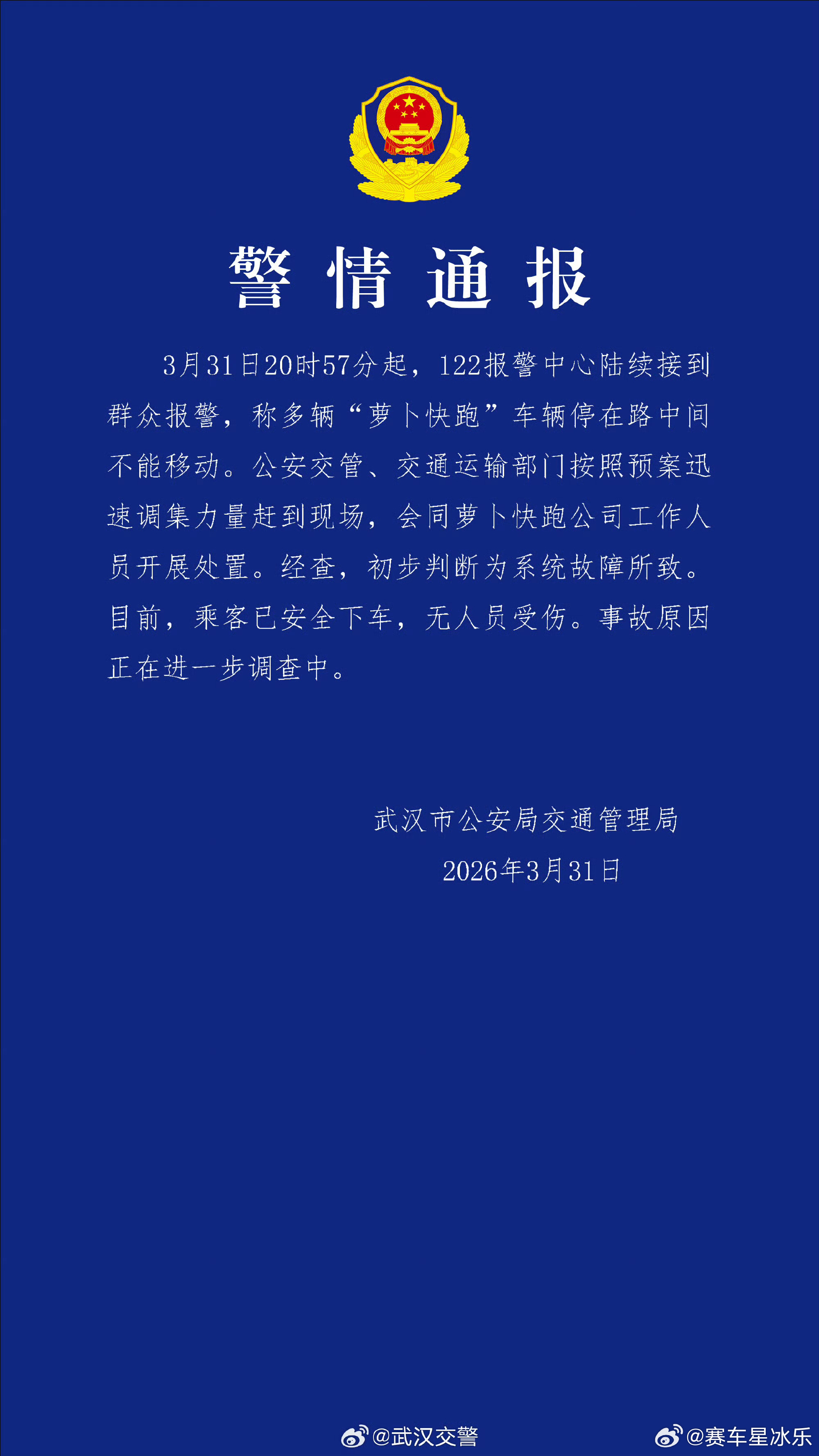 昨天武汉萝卜快跑这个事件影响不小,都出警情通报了。3月31日晚间,武汉多地出现萝