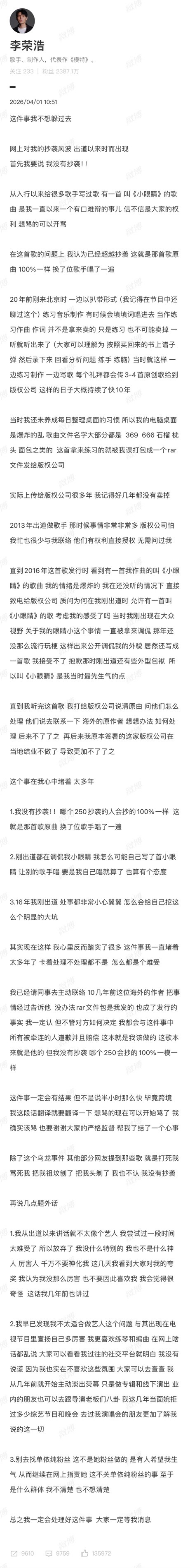 李荣浩否认抄袭李荣浩的回应来了,并详细讲述始末:多年前自己的练习歌曲,不是抄袭,而是一模一样照着扒的,误发给版权公司,之后被发行,不了了之。