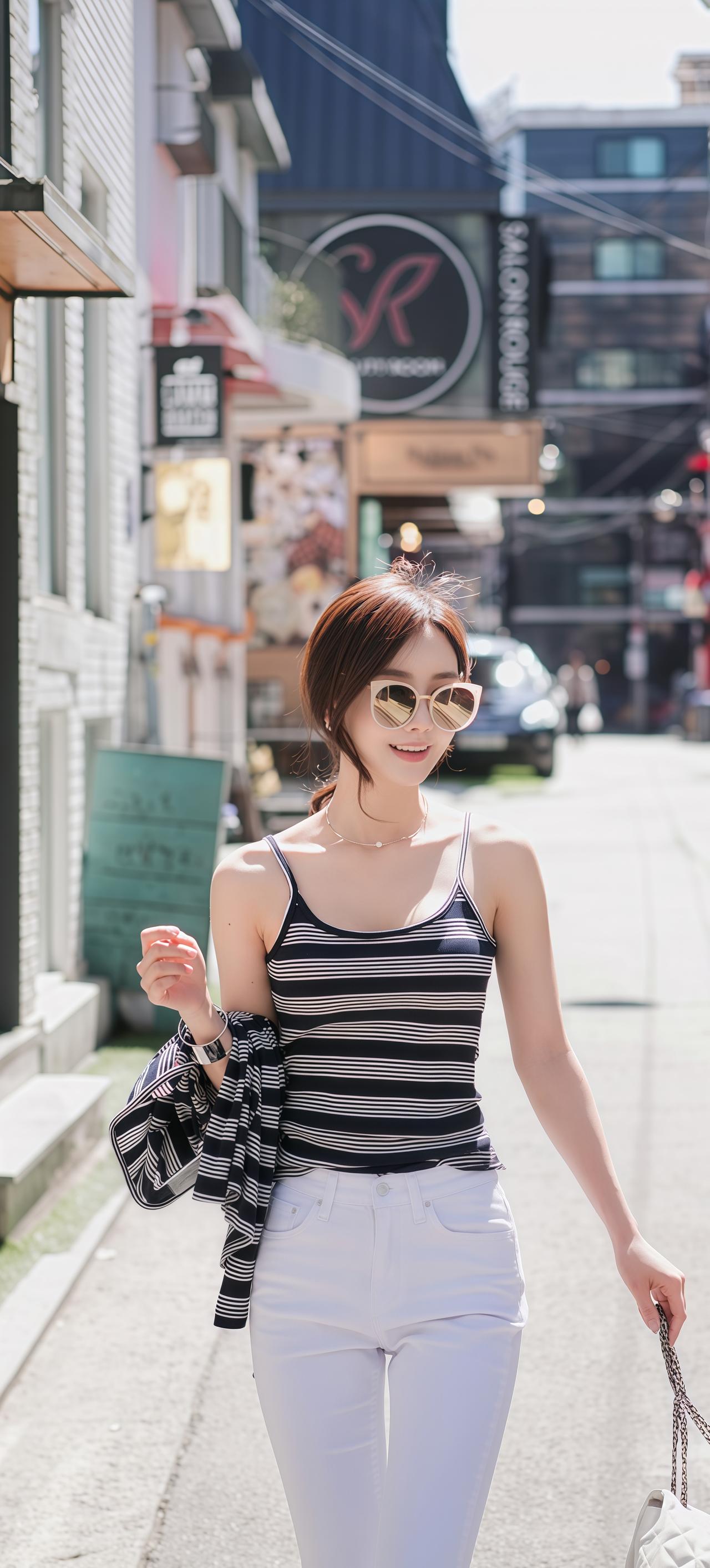 夏日街拍,时尚穿搭,墨镜与条纹的完美搭配。