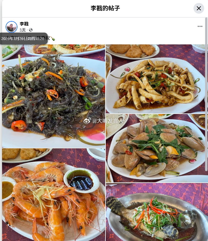 李敖儿子李戡,在柯文哲3月26日下午被宣判17年徒刑的几小时后发贴,"太爽了,大吃一顿庆祝"(图1)