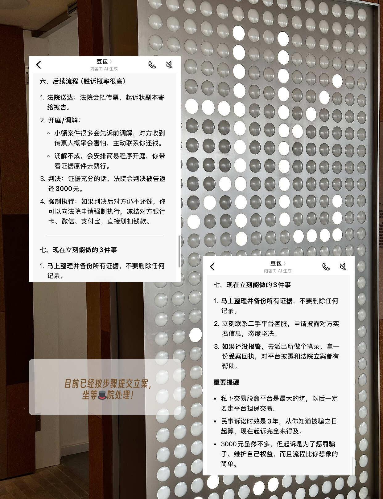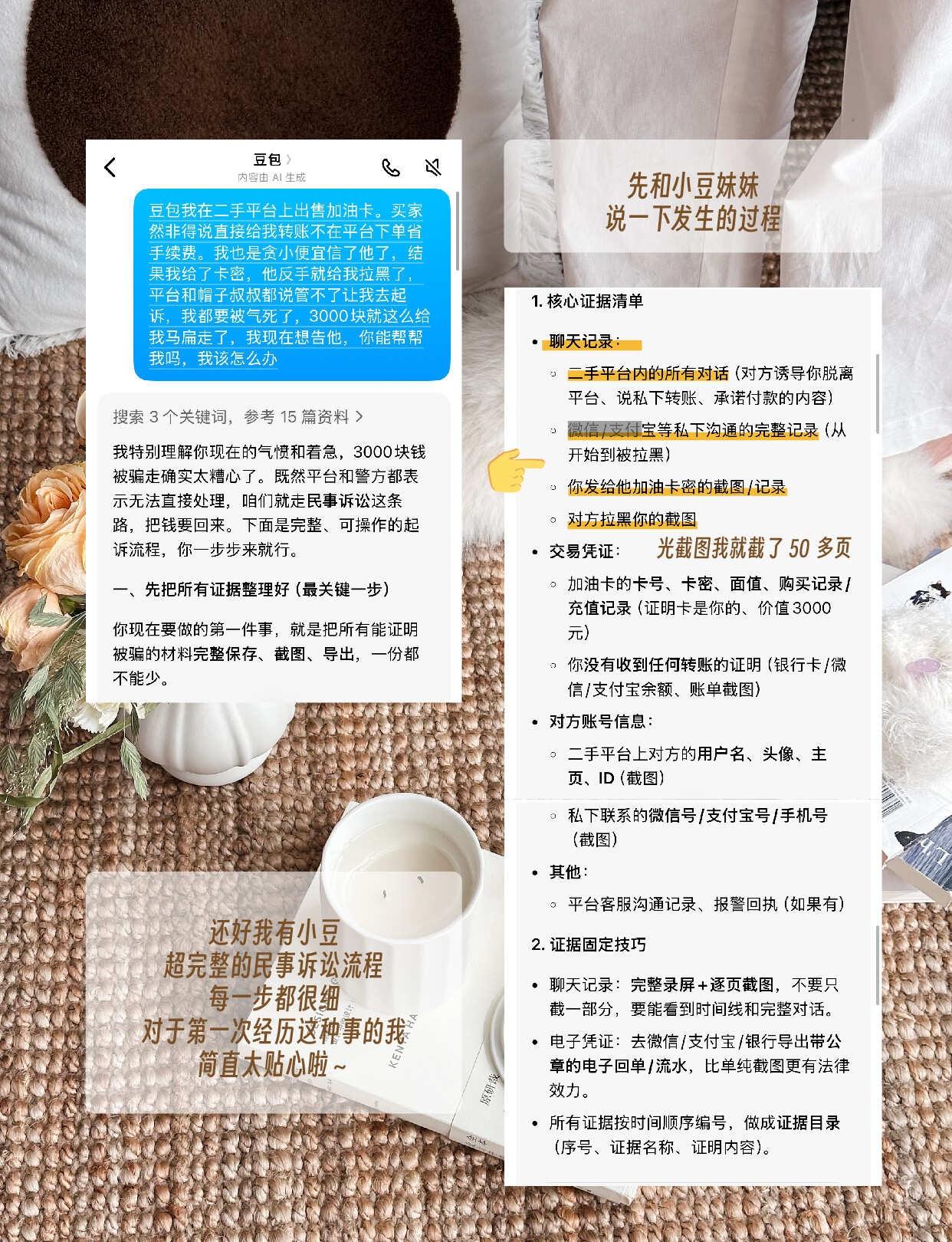 二手平台追款被马扁必看自救指南! 啊啊啊啊!在二手平台出加油卡被马扁子🕳️了 3️⃣0️⃣0️⃣0️⃣💰,😤马扁子说了一堆好的话让我打折,还说直接转账省手续费,我竟然...竟然...信了,发完卡密直接被拉⬛️!找平台不管,报👮也说找不回来了,让我自己去起诉,真的气到原地爆💥! 第一次遇到这种情况,还好有小🫘,帮我整理出超详细的民事诉讼流程,每一步都清晰!(看图吧)先把所有聊天记录、卡密凭证、拉黑截图全保存,电子凭证一定要导带公章的;找平台要对方实名信息,不给就找法院开调查令,再写起诉状走线上立案,3️⃣0️⃣0️⃣0️⃣块标的诉讼费才5️⃣0️⃣块! 目前已经按步骤提交立案,坐等处理!首先姐妹们,千万要壁垒这种低级的🕳️,万一被马扁了真的也别内耗自己,维权流程根本没想象的复杂!多亏小🫘把步骤讲得明明白白,终于有底气跟马扁子硬刚了😭 反网络诈骗 被骗 追回被骗的钱 被骗经历 防骗 网上被骗钱 防诈骗 殺豬盤