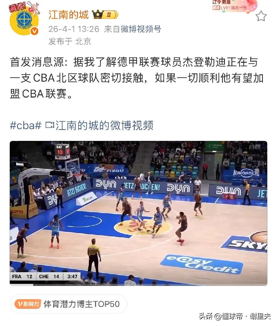 来自外媒消息显示,辽宁男篮并不会和哈维续约,ESPN透露:NBL老鹰队和哈维续约两年,意味着辽宁队就算是想和哈维续约也无计可施,哈维不会留在CBA打球。与此同时,来自国内媒体人透露:德甲联赛中锋球员杰登勒迪和一支北区球队密切接触;他身高2.06米,NBA选秀落选秀,身体强壮,低位单打和篮下终结高效。正是辽宁急需补强的大外援类型,真希望是他