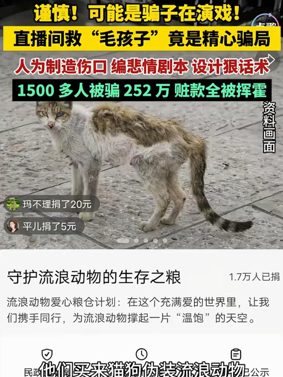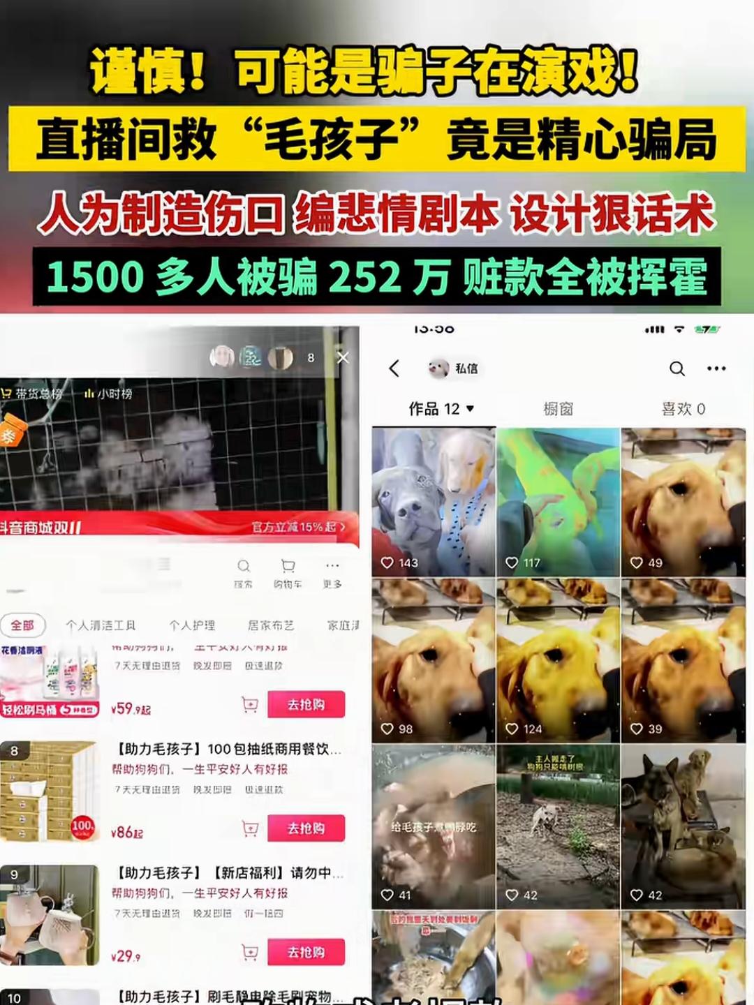 1500多人被骗252万,钱款全部被挥霍一空。谨防“爱心”直播间的精心骗局,别让自己的善良,为他们的挥霍埋单。 2024年7月13日,某个“爱心”直播间里,满脸愁容甚至声泪俱下的“爱心救助”直播,一口一个“家人们,帮帮它们”。在他们身后,是成群的流浪猫狗,或关在一个个笼子里,或直接散养在大院里。 这些成群的猫狗蜷缩在那里,瘦骨嶙峋、毛发成团,浑身沾满了污垢,甚至一些猫狗的身上还带着伤,看上去丝毫没有一点生机。 就在这样的背景下,主播站在镜头前,用哽咽的语气一口一个“家人”的叫着,表示身后是一个多年来一心救助流浪动物的基地,但是现在却要干不下去了,身后的530多只流浪狗和160多只流浪猫,眼看着撑不住了,已经没有东西吃了,求求家人们帮帮它们,救救它们吧! 除了煽情的解说,主播还不断呼吁爱心人士,可以通过其关联的店铺下单猫粮、狗粮等物品,这些猫粮、狗粮可以直接发到求助的这个救助基地,为“毛孩子”们送去生存的希望。 看到这样的场景,正在看直播的方女士心里非常难受,她决定一定要帮助那些“毛孩子”度过难关。 随后,方女士在直播关联的店铺中买了2000元狗粮、200元猫粮。次日善心大发的方女士觉得有点少,又买了2000元狗粮、1000元玉米面。 看到自己购买的5200元狗粮、猫粮,想到那些“毛孩子”暂时不用挨饿了,方女士的心情也好了! 然而,让她想不到的是她的爱心,不过是别人精心策划好的一场骗局。 在方女士下单之后,店铺客服告诉她,她的这些爱心捐赠,会直接发到直播中求助的流浪动物救助中心,地址是河南周口商水县。 对此方女士并没有什么怀疑,反而觉得商家这样做,可以更快地让“毛孩子”们吃上这些食物,让它们不再挨饿。 然而就在方女士想着“毛孩子”们不再挨饿时,却在物流上发现了问题。 她一直希望自己捐赠的东西能尽快到达“毛孩子”们的嘴里,所以对物流进度也格外上心。 不过就在她再一次观看物流进度时,发现收货地址并不是原来的商水县,变成了河南项城的另一个地方。此时方女士的心里产生了一丝怀疑。 想到项城的收货点离自己不远,她打算亲自去看一下。 结果在项城的收货点里,方女士没看到自己买的猫粮、狗粮,只有两个属于她的文件袋包裹。另外在收货点里,同样的文件袋包裹还有几十个。这些文件袋包裹,寄件信息一样,不需要派送,都是统一签收的。 此时方女士已经感觉被骗了,接着她又去了直播中所说的商水县那个基地,发现根本找不到。 2024年8月1日,方女士向商水县公安局报案。此后发现受骗的不止方女士,全国各地很多人都有同样的经历。 后经调查,上述直播间里的求助就是一个精心设计好的骗局。 从2022年下半年,以李某某为首,包括其姐夫、姐姐、朋友在内的团伙,发现可以利用流浪猫狗,骗取爱狗(猫)人士的捐助,便精心设下了这个局。 布局上,他们在商水县的村子里租了一个空院,从贩子手上买了一些猫狗充当流浪猫狗,又在院中搭起了简单的棚舍当直播背景。 剧本上,以虚构的530多只流浪狗、160多只流浪猫为吸晴点,以救助基地出现“断粮”、“干不下去”等原因呼吁大家捐助。 运作上,先是打着救助流浪动物的称号,通过短视频、直播等形式引流,然后在直播时“卖惨”,呼吁爱狗(猫)人士捐赠,接着以虚假发货的方式骗取捐赠款。 为了让那些猫狗更像流浪猫狗,更容易引起同情,他们故意将其饿瘦、生病,甚至故意人为的弄出伤痕。 后来他们为了降低成本,干脆卖掉了院子里的猫狗,直接从网上下截视频二次剪辑后,继续骗取爱狗(猫)人士的同情与捐助。 后经查实,李某某一伙共至1500多人被骗252万余元,而用在流浪动物上的仅占0.13%,另60余万用于平台“投流”,剩下的被其挥霍一空。 说到这儿,忍不住想起一句话“直播间里全是‘家人’,直播间外都成‘冤总’”。 献爱心、搞捐助本是好事,但也要擦亮双眼,毕竟网络上的事情,真真假假的太多!