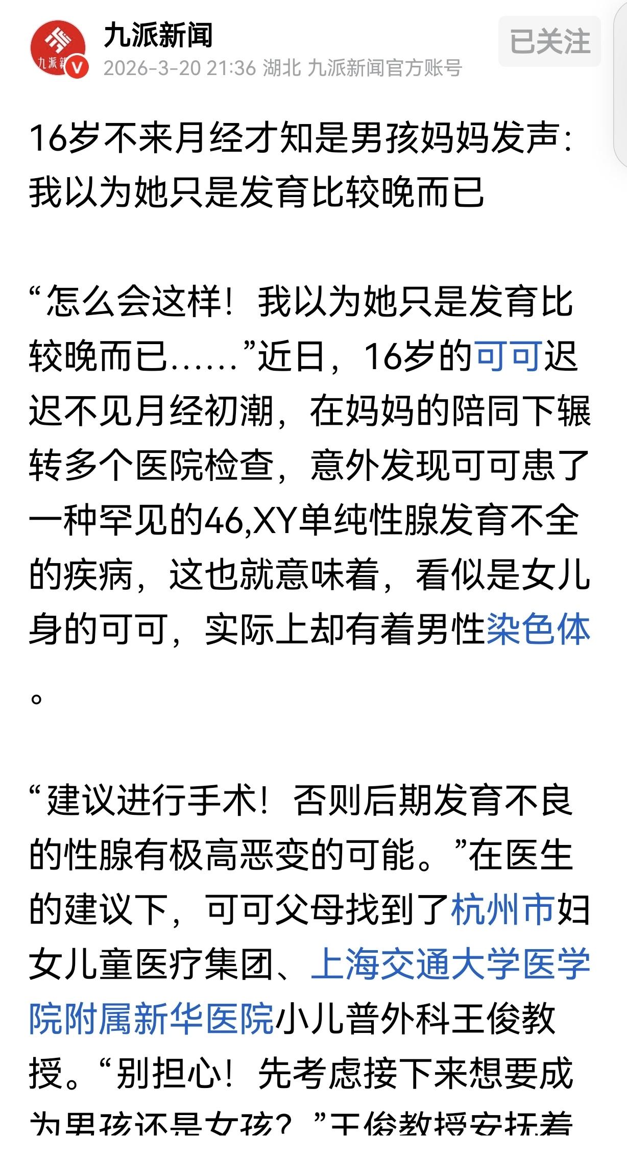 上海,一女子的女儿16岁了,可月经迟迟没来,女子觉得不对劲,带着女儿看医生,才惊讶发现女儿变成了儿子,女子傻眼了,她以为女儿只是发育比较晚,医生确诊女儿患了一种罕见的46,XY单纯性腺发育不全的疾病,也就是女儿虽是女儿身,体内却有男性染色体。接下来,女子面临2个选择,是把女儿变成女儿?还是把女儿变成儿子?但无论男女,TA一生都无法生育。 16 年的认知在一纸诊断面前轰然倒塌,任谁都无法瞬间接受。这位母亲的世界被彻底颠覆,她看着眼前熟悉的女儿,却被告知这是一个生物学意义上的 “儿子”。这种冲击远比任何虚构故事都要残酷,它不是选择题,而是必须直面的残酷现实。 没人能体会她心中的天崩地裂,更没人能替她做那个关乎孩子一生的决定。 医生的解释冰冷而清晰,这并非传统意义上的 “性别转换”,而是一种名为 46,XY 单纯性腺发育不全的先天性疾病。 孩子的染色体核型是男性的 46,XY,但在胚胎发育初期,决定性别分化的关键环节出了错,本该发育成睾丸的组织停留在了原始状态,导致身体全程按照女性轨迹生长微博。这是生命程序里一个极小却致命的漏洞,隐藏了整整 16 年。 这种隐匿性正是它最可怕的地方。孩子从出生起就拥有标准的女性外生殖器,成长过程与普通女孩无异,身高、体态、智力都完全正常。 母亲自然将其当作女儿精心养育,看着她长大、上学、交朋友,直到青春期的信号灯迟迟不亮,才敲响了最后的警钟。谁能想到,晚发育的背后,竟是改写人生的密码。 比确诊更难的是抉择。医生明确告知,发育不良的性腺组织癌变风险极高,必须尽快手术切除。手术之后,摆在母女面前的只有两条路:要么,通过长期激素治疗,维持女孩的身份,帮助她发育第二性征,模拟月经周期;要么,彻底转向男性身份,用雄性激素塑造男性特征。 无论选择哪条路,有一个结局早已注定 —— 孩子将永久失去生育能力。因为先天没有发育完整的生殖腺体,既不会产生卵子,也无法生成精子。 这意味着,她或他未来可以拥有爱情和婚姻,却无法拥有自己血脉相连的孩子。这个残酷的事实,像一块巨石压在母亲心头,让她每一次思考都痛彻心扉。 母亲反复权衡,夜不能寐。她看着孩子从小到大的照片,回忆着 16 年来的点点滴滴。孩子一直以女孩的身份活着,有自己的闺蜜、喜好和对未来的憧憬,她的自我认同早已深深扎根于 “女性” 这个角色。强行扭转,无异于将她的过去、现在和未来全部撕裂。 与此同时,医学案例也在不断佐证着风险与选择。国内曾有 27 岁的类似患者,因长期忽视原发性闭经,最终在性腺中发现了恶性肿瘤。幸运的是肿瘤未转移,但这也印证了及时手术的紧迫性。每拖延一天,孩子就多一分被癌症侵袭的危险。 经过无数次的挣扎与咨询,母亲和孩子最终达成了共识。既然身份认同无法改写,既然 16 年的人生轨迹清晰可见,那就选择尊重既定的人生,继续以女儿的身份走下去。手术的目的不是改变性别,而是为了切除病灶,保住健康,让她能以自己认可的样子活下去。 手术进行得很顺利,通过微创腹腔镜切除了体内有隐患的条索状性腺。术后,孩子需要长期服用雌孕激素,这套人工方案将帮助她发育乳房,维持女性体态,并建立周期性的 “月经”。她的外表、她的生活、她的内心,都将继续属于那个她熟悉的女孩。 这场 16 年的 “美丽误会”,最终以一场手术和终身服药落下帷幕。对母亲而言,结果是不幸中的万幸。她没有失去养育了 16 年的女儿,只是女儿的人生被附上了永久的遗憾。她必须学着接受,孩子健康活着,比什么都重要。 这类罕见病并非孤例,全球发病率约为两万分之一。它们共同揭示了一个真相:性别并非非黑即白。在 XX 与 XY 之外,存在着许多不为人知的中间地带。这些案例提醒着每一位家长,青春期信号异常绝非小事,13 岁无第二性征发育或 15 岁仍无月经初潮,必须立即就医。 生命的复杂与偶然,远超过人类的想象。我们习惯用二元对立的眼光定义世界,却常常忽略了个体在先天偶然中的挣扎与坚守。 对这个上海家庭而言,选择没有对错,只有对生命最基本的尊重 —— 尊重她 16 年的过往,尊重她内心的归属,尊重她作为一个独立个体,决定自己是谁的权利。 这场变故改变了很多,却也最终证明了一件事:染色体决定的是生理结构,却决定不了一个人灵魂的性别。当医学的冰冷介入温暖的人生,最终的答案永远是尊重与爱。 我们无法选择出身,但可以选择如何有尊严地活下去。各位网友,如果你是这位母亲,你会如何抉择?
