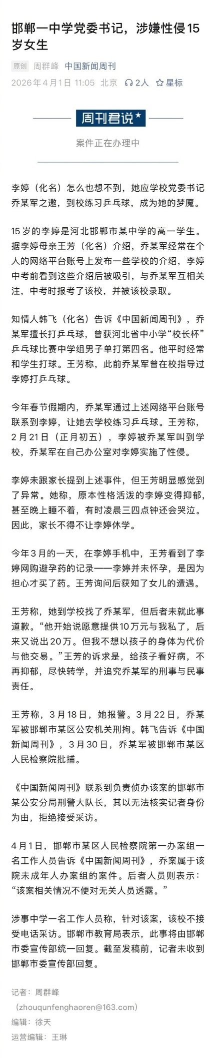 邯郸某中学党委书记涉嫌性侵学生 邯郸一中学党委书记 涉嫌性侵15岁女生被捕女生母