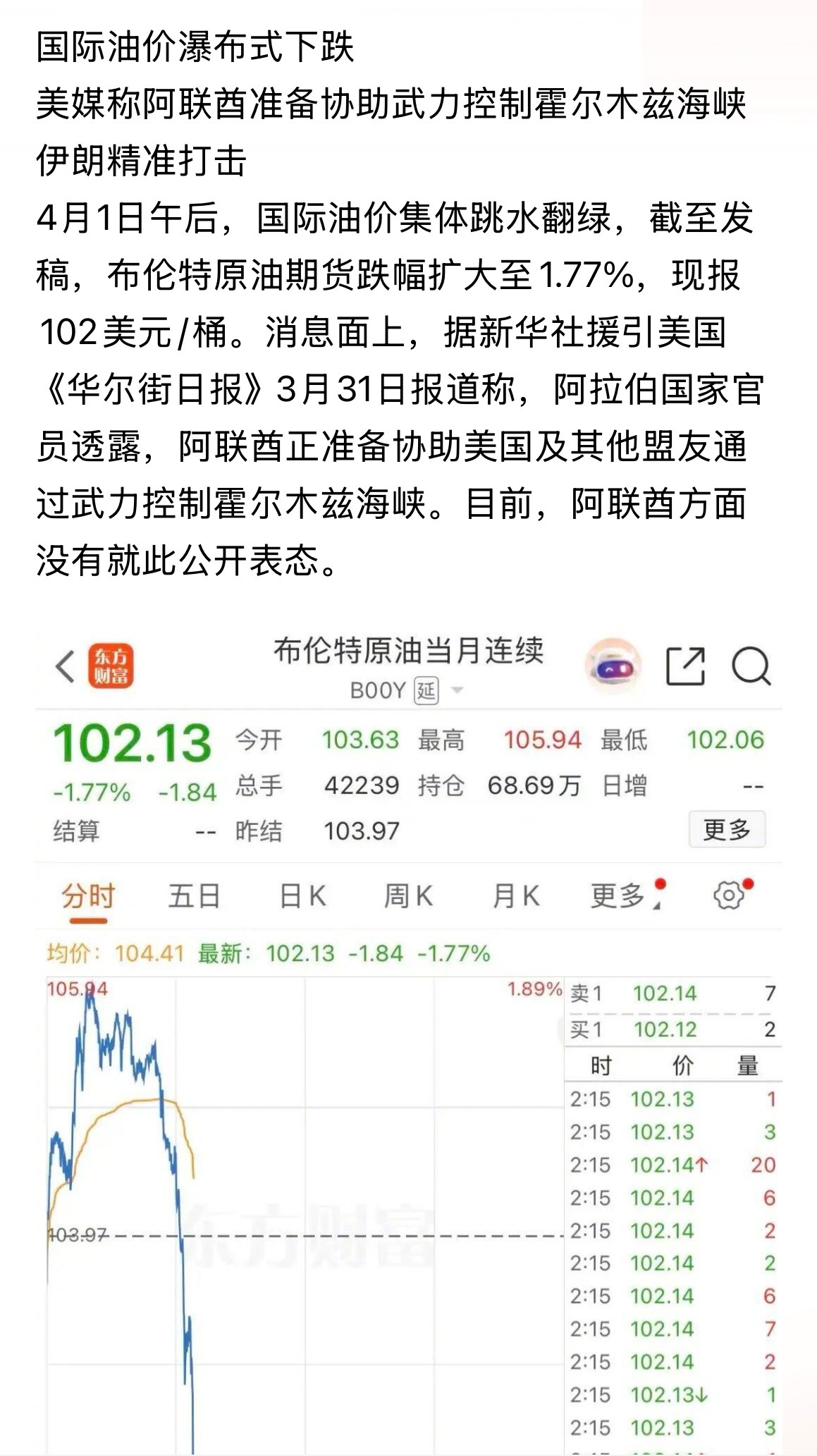 截至2026年4月1日16:46(北京时),国际原油主力合约实时行情如下: