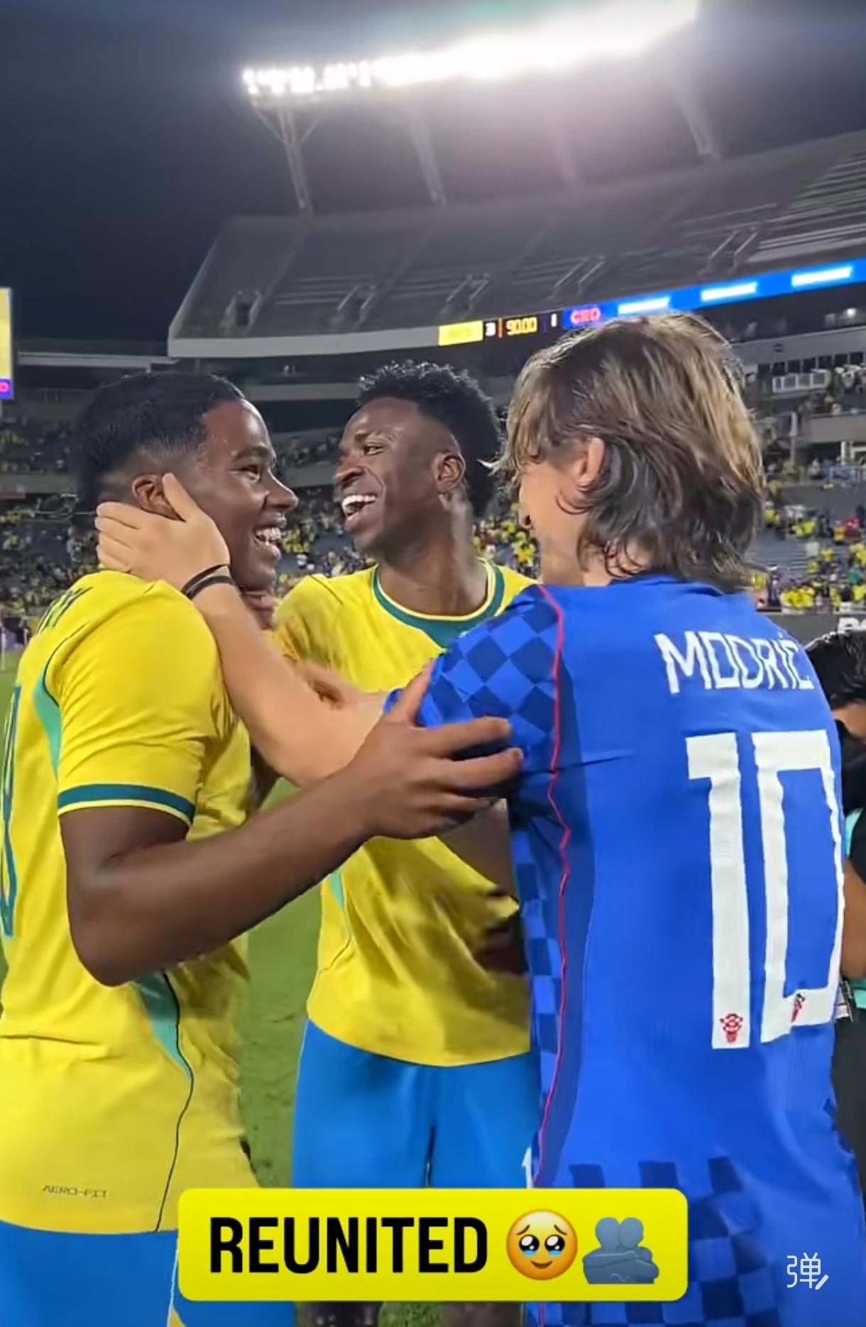 这一刻,安切洛蒂、维尼休斯恨不得把莫德里奇拐到巴西队! 美国一场热身赛,巴西队3-1轻松击败克罗地亚,安切洛蒂终于再次与莫德里奇相见! 在成功做掉巴萨的拉菲尼亚助攻皇马之后,安切洛蒂还是让维尼休斯首发出任左边锋,正是维尼休斯长途奔袭后的一脚秒传,达尼洛推射破门,巴西1-0领先克罗地亚,为巴西队打开胜利之门! 本场比赛的意义不止于此! 安切洛蒂、维尼休斯、恩德里克见到魔笛,简直就像见到了亲人一样! 安切洛蒂满眼都是暖意,维尼休斯像个小迷弟,恩德里克从后面将魔笛抱起,然后像多年未见的兄弟一样亲切攀谈! 安切洛蒂执教的巴西队,越来越像皇马,还真就缺了个莫德里奇这般人物!