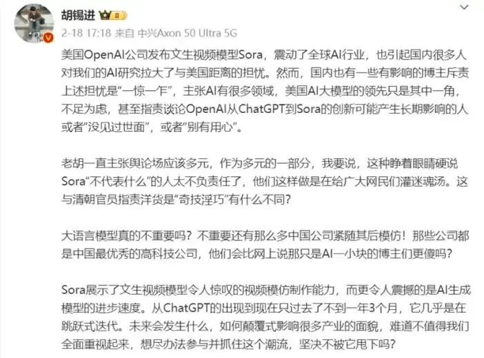 胡锡进以营收只增长0.2%为由贬损国企,这与老胡过往吹捧外企形成了鲜明对比。 比如2024年4月,胡锡进为特斯拉呐喊助威,老胡使用“轰动”一词称赞特斯拉当年生产的车型。又如2024年2月,胡锡进为美国的openai公司叫好,老胡使用“令人震撼”一词称赞该公司推出的文生视频模型sora。 胡锡进这么卖力地吹捧美企,结果又如何呢?2025年特斯拉销量下降8.6%,2026年预期也是下降的。至于openai的sora大模型,今年3月直接宣布关停。 可见胡锡进对美企的吹捧与其发展趋势大相径庭,老胡的溜须话语未能奏效,实在是大煞风景。 那么胡锡进一边贬损国企,一边吹捧外企,老胡的判断能力是否可靠呢?