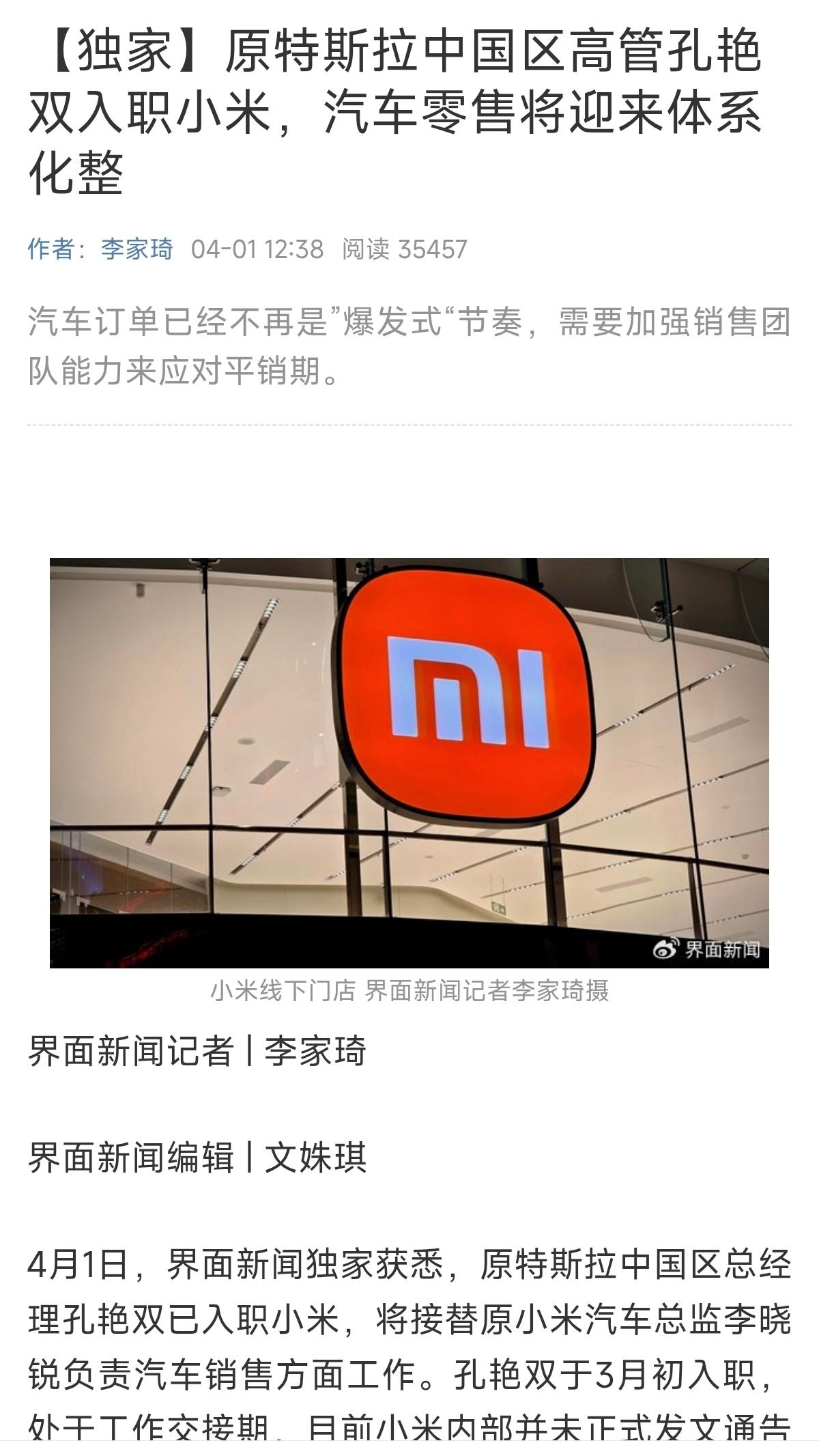 界面新闻:原特斯拉中国区总经理孔艳双已入职小米汽车,将负责汽车销售方面工作。