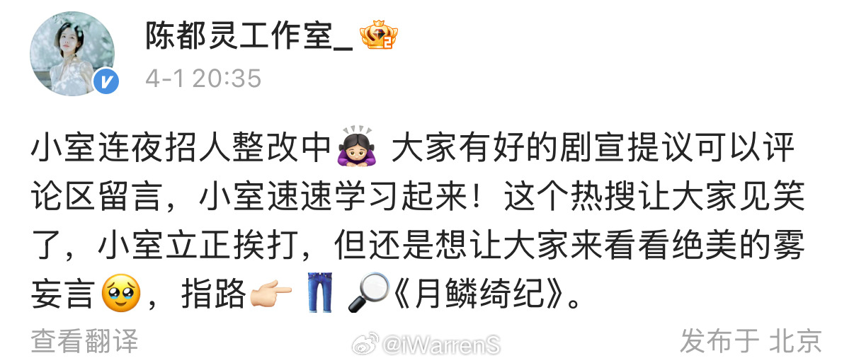 陈都灵工作室发文回应rs了,哈哈哈……来看陈都灵雾妄言啦!陈都灵工作室 剧宣