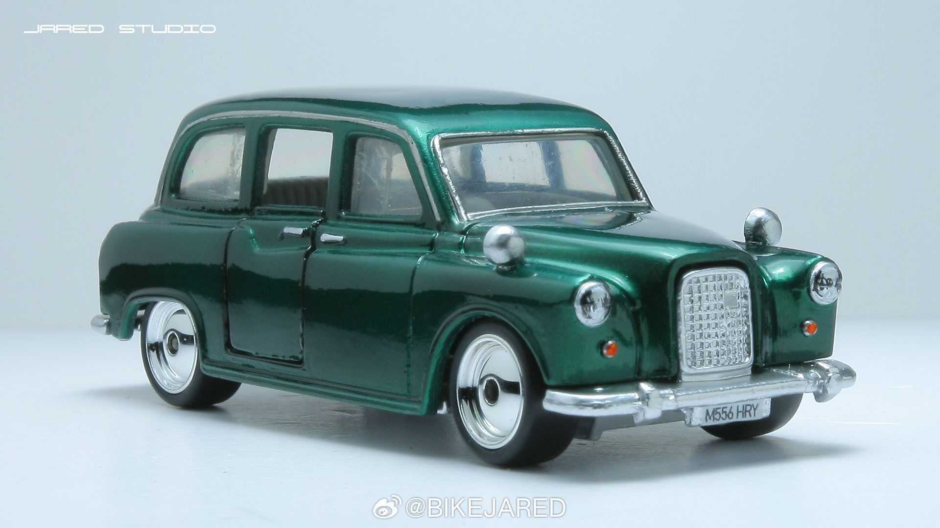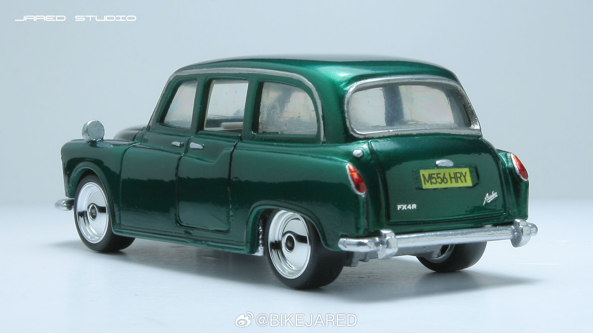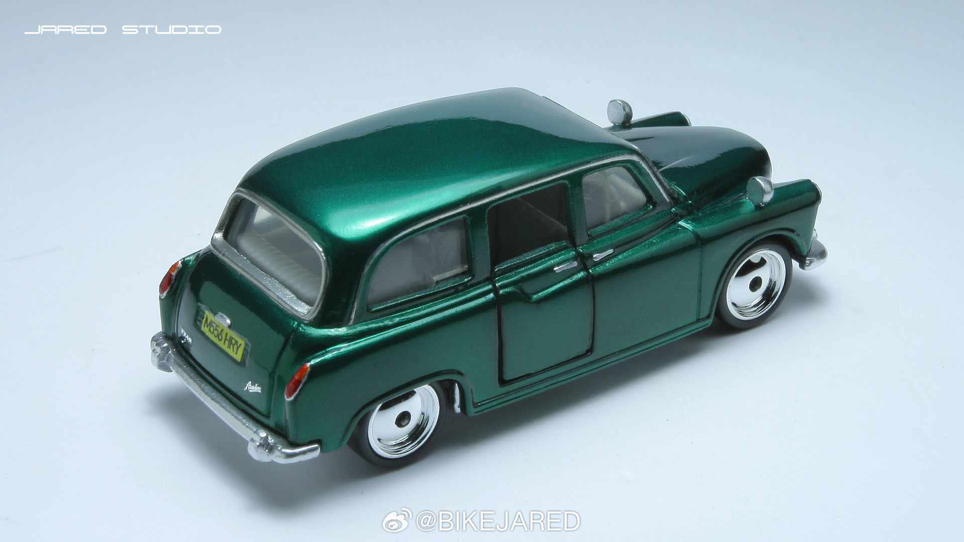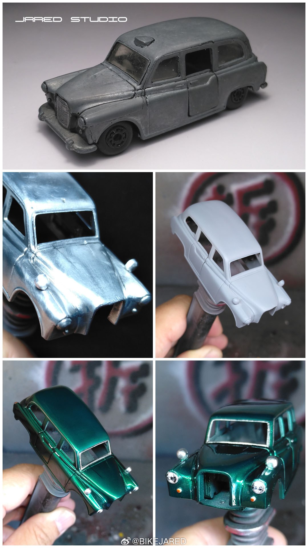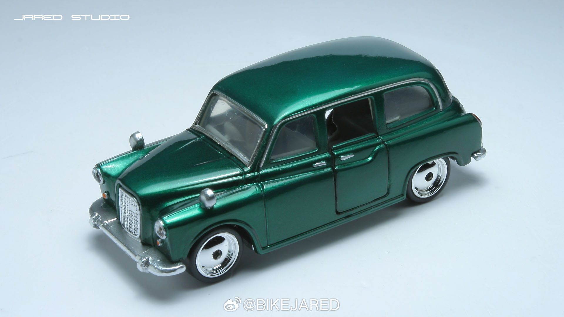 matchbox火柴盒伦敦出租车奥斯汀小比例车模 完工一辆老火柴盒奥斯汀FX4出租车改造,去掉出租顶灯,这算营转非。手工制作铝合金后视镜铆接安装,喷金属深绿,手绘车灯,基础细化,换装电镀大饼轮。张家口