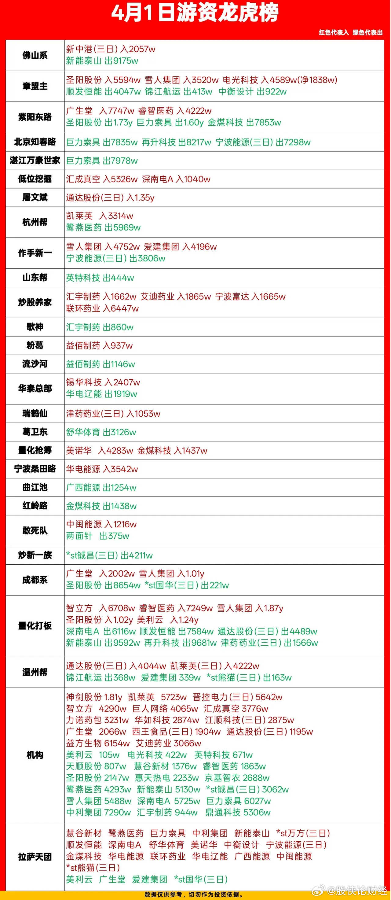 🔥4月1日龙虎榜周二榜首,游资大佬齐聚!🔥4月1日龙虎榜太刺激了,游资大