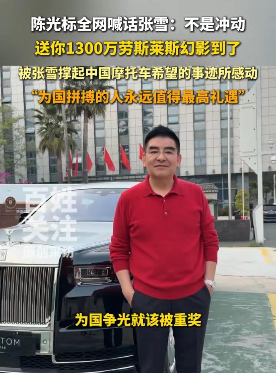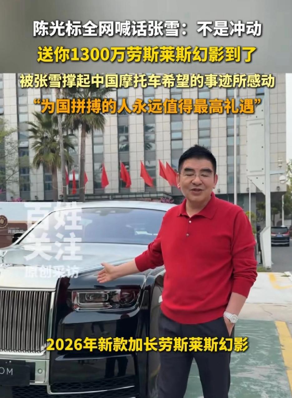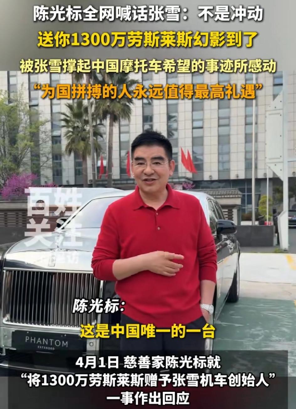 陈光标说不是冲动,就要送给他,要送给张雪,价值1300万的加长的2006新款劳斯莱斯幻影。陈光标太大方了,他说张雪为国争光,失败了又重来,我就是要送给他。我想告诉大家,为国争光就值得被表彰。 网友说这1300万可以救助很多贫困的学生,张学不需要锦上添花,但有些人需要雪中送炭。还有人说看张雪会不会要,张雪至今未做回应。