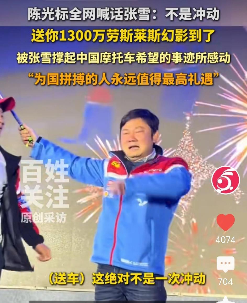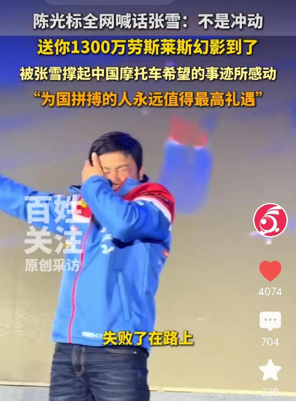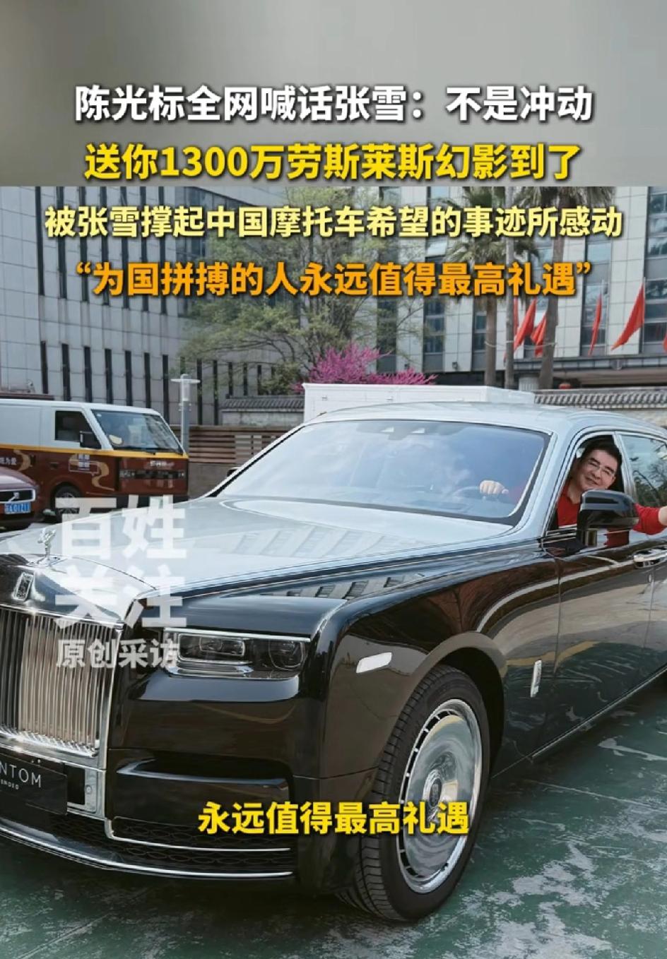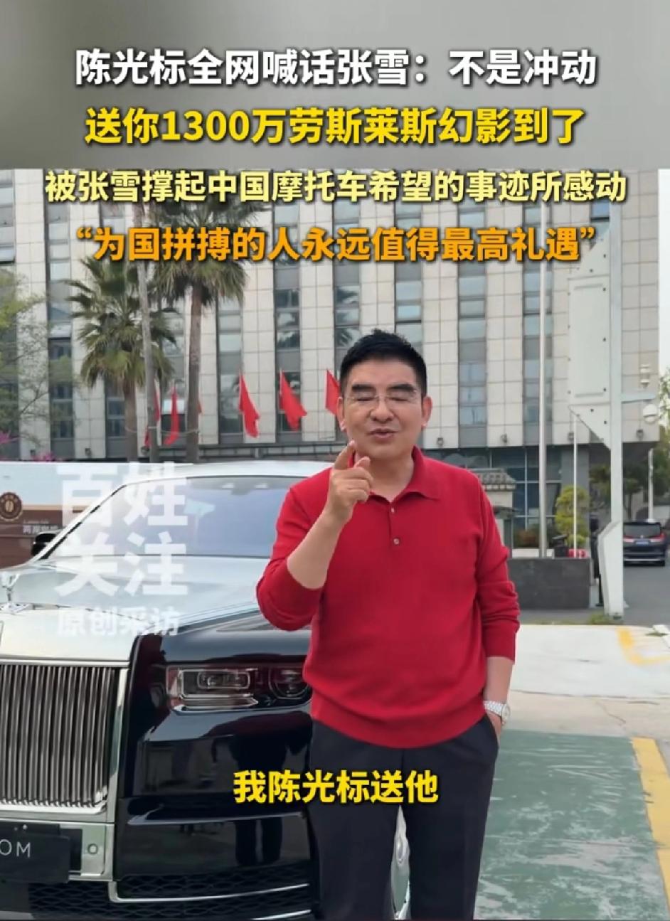 陈光标说不是冲动,就要送给他,要送给张雪,价值1300万的加长的2006新款劳斯莱斯幻影。陈光标太大方了,他说张雪为国争光,失败了又重来,我就是要送给他。我想告诉大家,为国争光就值得被表彰。 网友说这1300万可以救助很多贫困的学生,张学不需要锦上添花,但有些人需要雪中送炭。还有人说看张雪会不会要,张雪至今未做回应。