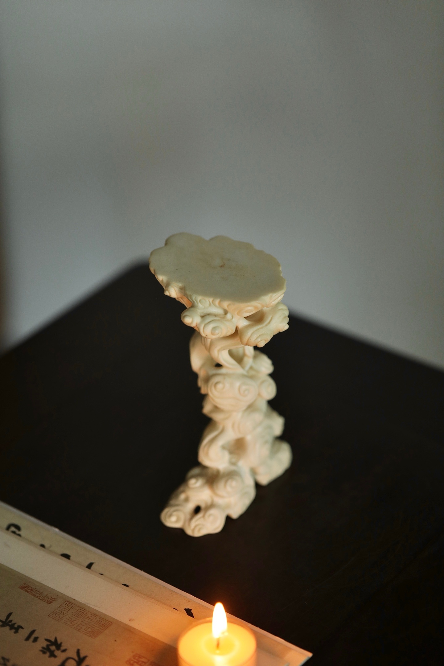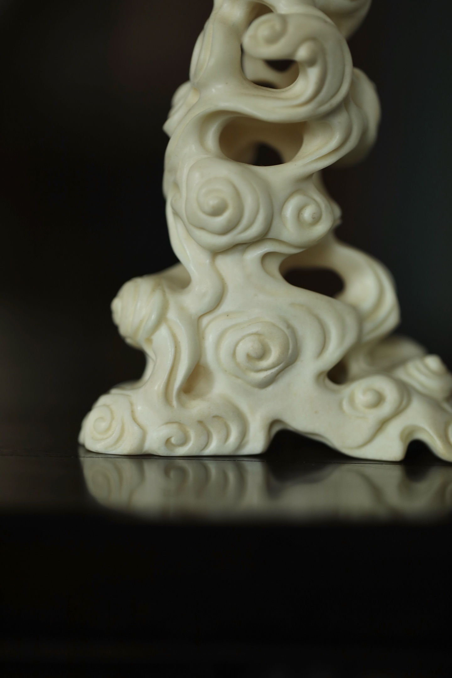 将整料雕作祥云缭绕之态:云纹婉转灵动,卷舒自如,层层叠叠,镂空通透,宛若青云出岫,仙气盎然。整器造型挺拔,结构稳固,承托面平整,可置香具、摆件、奇石,是文房、香道、雅玩的绝佳配器。