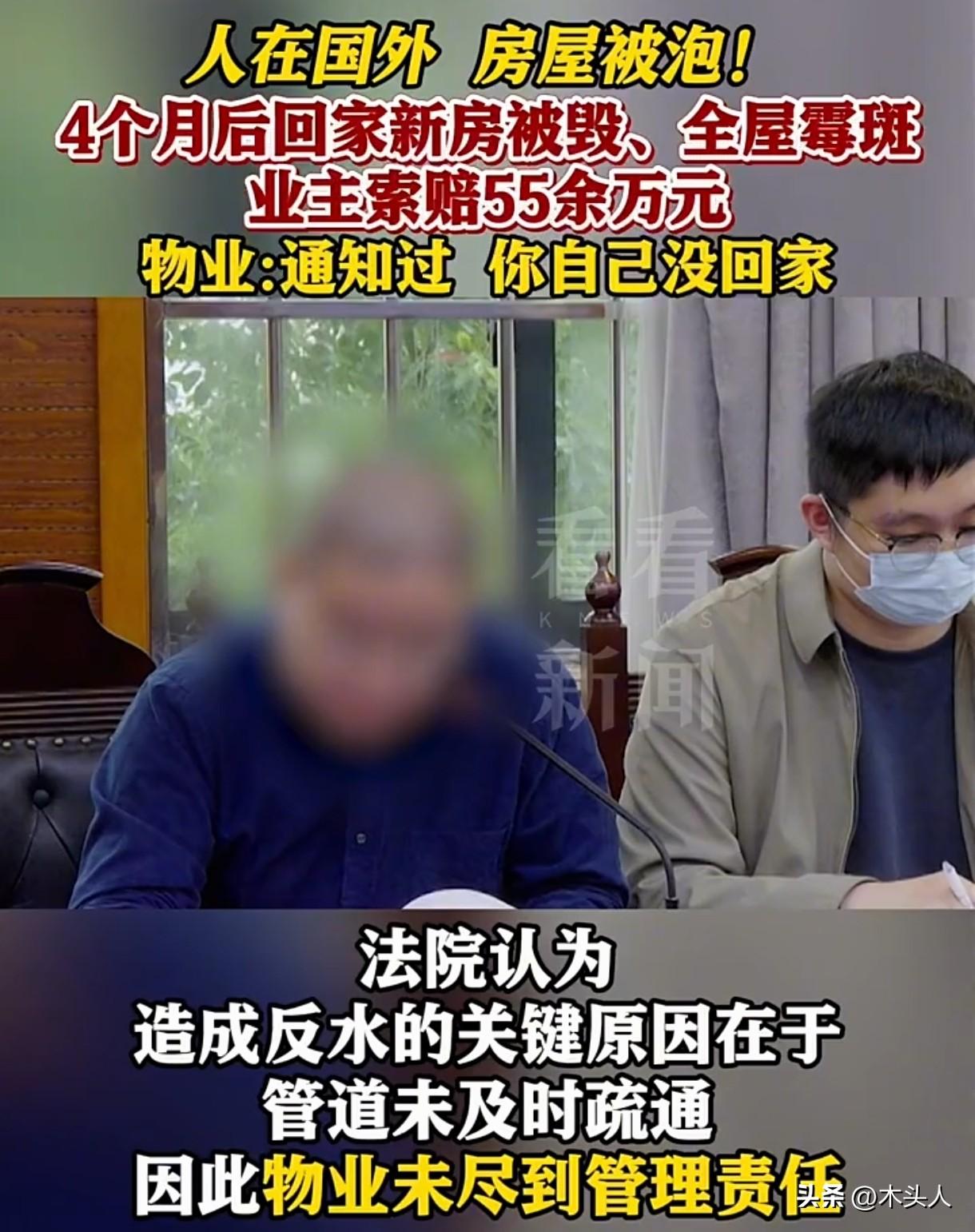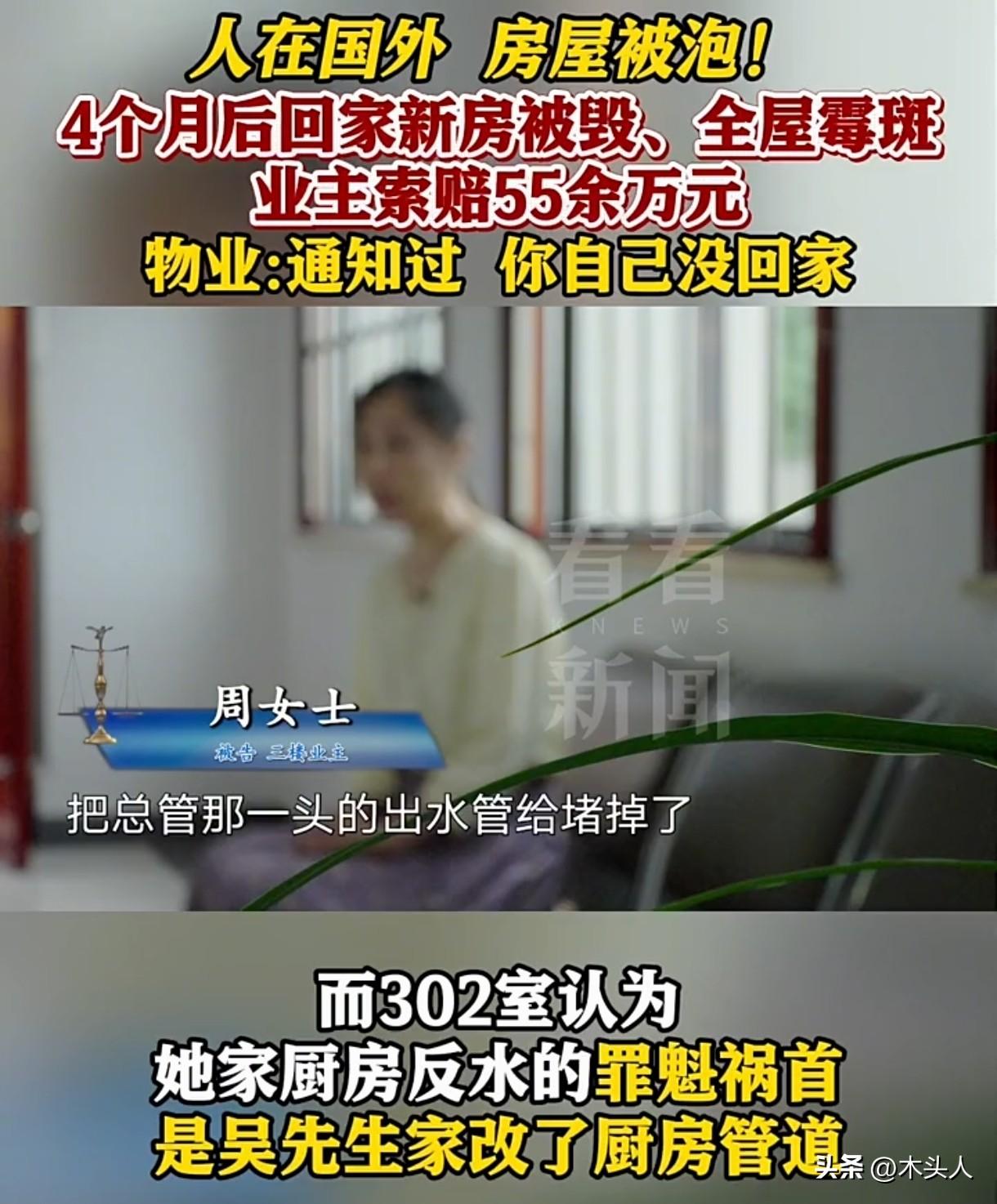 上海,男子去了国外工作,接到电话,说他家楼上邻居家反水,有污水漏到了男子二楼家里,让男子回家处理。男子买了机票后,想着情况不严重,又把机票退了。4个月后,他回家一看,崩溃了:他家里墙体发霉、定制家具报废、电器、钢琴都泡水了,损失高达53万余元,他要求三楼邻居、物业和保险公司赔偿。可三楼邻居也很委屈:他把总管堵了,导致水往我家反了。物业:他家泡了4个月,让他回家处理他不处理,扩大损失了!结果让人意想不到。 吴先生长期在国外工作,他在上海的房子一直空着,没有人居住。 2024年8月,他接到物业电话,说他家楼上,3楼的周女士家厨房的公共管道反水了,有污水渗漏到了吴先生,让他尽快回家处理。 听到家里有可能被水泡了,吴先生也很着急。 家里的装修并不便宜,全屋定制家具、电器,还有他最爱的钢琴和珍藏的1000多本图书,这些都是不能泡水的,他订了机票,打算回国看看。 后来吴先生听说是楼上的租客没有关水龙头,他抱了一丝侥幸,想着应该没事,就把机票给退了。 2024年12月,吴先生忙完工作,从国外回到上海。 可他打开房门,眼前的景象却让他有些崩溃。 屋里一股霉味、定制家具、电器、钢琴和1000多本图书全部被泡坏了,家里一片狼藉,根本无法入住。 吴先生心疼不已,找人估算了家里的损失,房屋损失加修复的费用高达53万余元。 他要求楼上邻居周女士和物业以及保险公司给予赔偿。 可周女士却觉得自己也是受害者,自己家厨房反水,是因为吴先生把总管给封掉了,所以公共管道的水就反到了自己家里。 她发现自己家反水后,及时跟物业报修,不存在任何过错。 吴先生承认自己家确实做了厨房下水管道的改造,那是因为3年前,自己家遭遇了一次厨房反水,把自己家通往公共管道的接口封掉了,另外接了一根管道直通污水井。 但他强调,这个改造并不影响楼上楼下对公共管道的正常使用,周女士家反水是因为物业没有及时疏通公共管道,和自己家没关系,不过自己家被泡水,确实是周女士家反水导致的。 物业公司认为他们接到周女士的反水报修后,第一时间疏通管道,并通知了吴先生回家处理,吴先生自己耽误了时间,导致家里长期泡水发生霉变,吴先生自己也有责任。 跟周女士和物业沟通无果后,吴先生告上了法庭。 从法律角度来说,该如何认定此事呢? 《民法典》第942条规定:物业服务人应当按照约定和物业的使用性质,妥善维修、养护、清洁、绿化和经营管理物业服务区域内的业主共有部分,维护物业服务区域内的基本秩序,采取合理措施保护业主的人身、财产安全。 物业有义务对小区内的公共设施,包括公共管道进行定期检查、维护和疏通,以确保其正常运行。 周女士家厨房反水,是因为公共管道堵塞了。 物业作为公共管道的管理方,没有尽到管理责任,应当对吴先生家的损失承担主要责任。 吴先生虽然对自家厨房下水管道进行了改造,但他的改造行为并没有影响公共管道的正常使用,和周女士家反水之间没有直接的因果关系。 周女士发现家里反水后,及时跟物业报修,并让物业通知吴先生,不存在过错。 吴先生在得知楼上有污水渗漏下来后,没有及时回国处理,导致损失进一步扩大。 《民法典》第1173条‌规定:被侵权人对同一损害的发生或扩大有过错的,可以减轻侵权人的责任。 吴先生需要对自己因未及时处理而扩大的损失承担一定责任。 经调解,物业公司自愿赔偿吴先生27.8万元,周女士没有过错,无需承担责任。 保险公司另案赔偿周女士家5万元,对吴先生家不承担理赔责任。 在生活中,我们发现问题一定要及时处理,拖下去,只会让损失更大。 吴先生如果在得知渗水的第一时间,赶回家处理,家里的损失也不会这么大。 对此,大家怎么看?