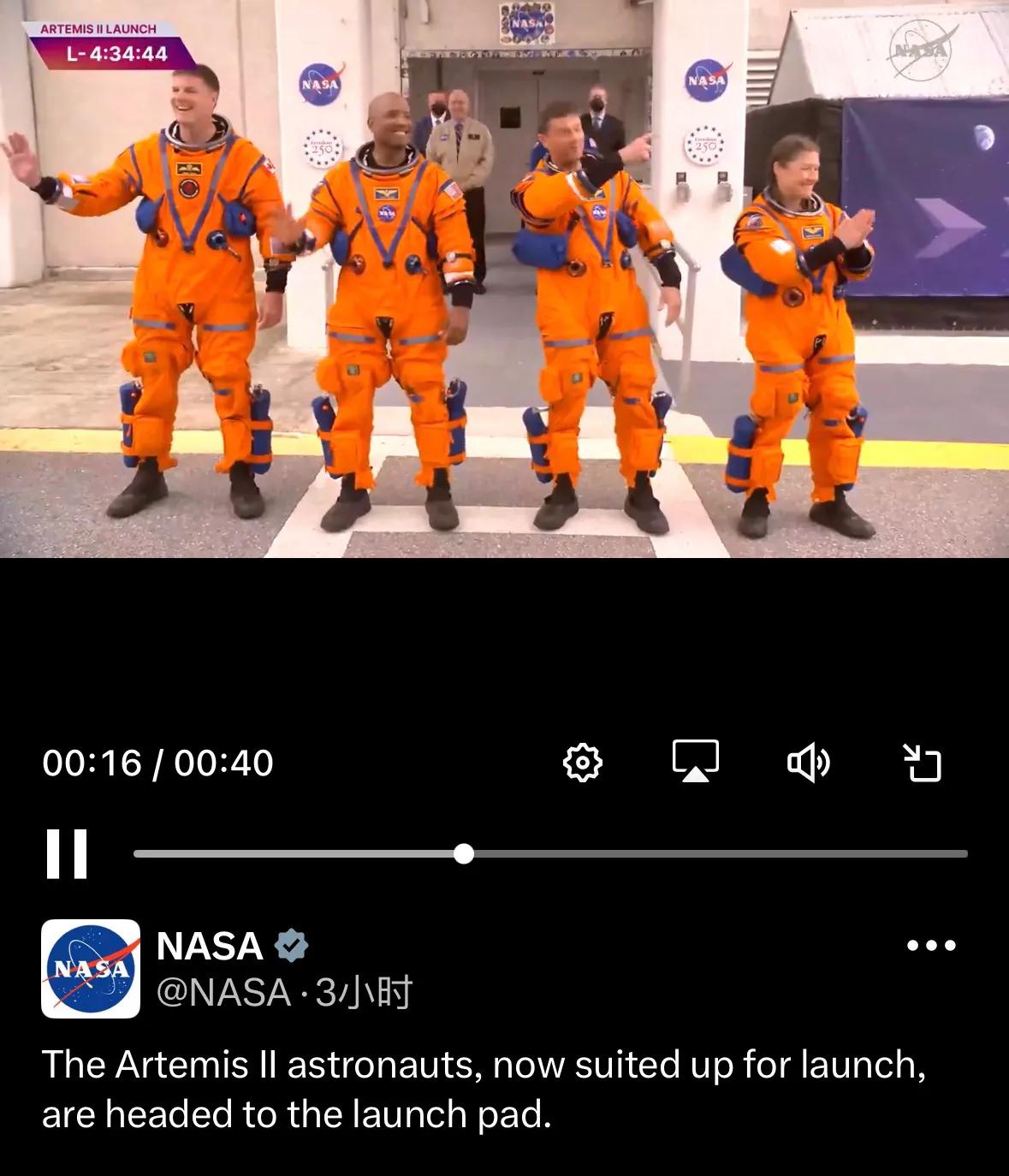 时隔五十多年,人类终于收拾行囊准备动身去月球了 - 今天美国东部时间下午6:24分左右(北京时间今天早上6:24分),美国NASA的阿尔忒弥斯二号搭载四名宇航员将从肯尼迪航天中心发射升空,展开为期约10天的绕月之旅。 四名宇航员在NASA员工欢呼声中整装出发,祝他们好运。 比起在波斯湾的战火和各种躺平内卷,探索星空才是更有意义的事。