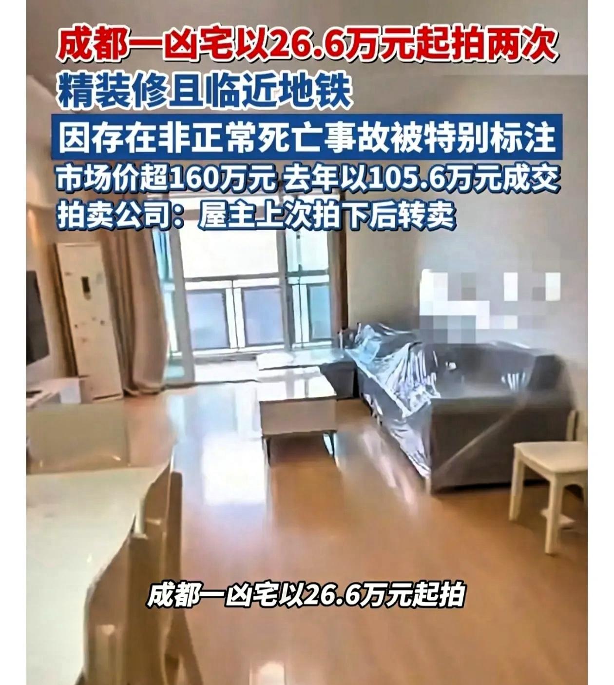 今天刷到成都一套房,彻底击碎了“穷比鬼可怕”的铁律。 双庆路这套89平方米的精装房,临近地铁,配套成熟,正常市场价格在160万左右。只因房屋曾发生过意外事件,近半年来多次流转,价格一路走低,成了不少人眼中的“捡漏机会”。 去年底,该房源以26万余元起拍,吸引多人参与竞价,最终以105万成交。但买家接手后很快产生顾虑,选择折价9万元再次出售。后续意向买家在深入了解后,宁愿损失5万元保证金,也选择放弃竞拍,可见这类房源的实际接受度并不高。 从事法拍相关行业的朋友表示,这类特殊房源看似差价巨大,实际隐患不少。银行在按揭审批上会更加谨慎,后续二次交易也容易遇冷,看似划算,实则流通性很差。 即便如此,当前这套房源起拍价降至16.6万,仍有三位参与者缴纳保证金准备竞拍。不少人抱着抄底心态,认为自己可以低价入手后快速转手获利,忽视了长期持有可能带来的心理压力与转手难题。 买房本是为了安稳生活,而这类房源的核心问题并不在房屋本身,而在大众普遍的心理接受度。即便价格再低,居住时的心理感受、未来的转让难度,都是实实在在的成本。 很多人总被差价吸引,觉得自己能成为例外,却忽略了房产的核心价值是居住与安心。单纯为了套利而忽视实际居住体验,很容易从捡漏变成接盘。 房产投资讲究稳健踏实,超出常理的低价背后,往往藏着不易察觉的隐性成本。面对诱惑保持理性,不被一时利益冲昏头脑,远比盲目冒险更重要。