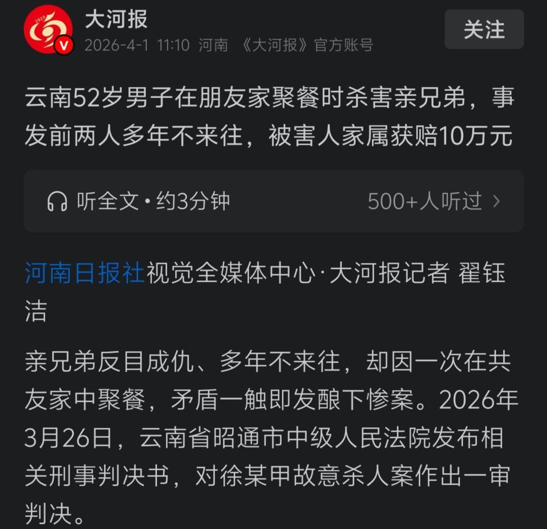 一死、一无期,就因为一些鸡毛蒜皮的小事,亲兄弟之间怎么下得去手?一时冲动,兄弟俩的家都破碎了,他们的父母又会怎么想? 徐某甲与徐某乙,虽是同父同母的亲兄弟,但因土地边界、分家等原因,导致他们多年来一直不和睦,经常出现口角之争,甚至亲兄弟动过手,村里也曾多次对他们调解。 在村子里,两个人一般不会有什么交流、往来,都在默默地互相避让着对方,有哥哥的地方一般不会看到弟弟,反之也一样。 不和睦的俩兄弟,相互避让的生活在一个村子里,本也没有什么大问题。然而就因为一次没有避让,却酿成了无法挽回的惨剧。 2025年8月6日,一个非常平常的日子。 当天下午,徐某甲被朋友孙某邀请到家里吃饭,同在的还有其他几位朋友。 几个朋友围坐在一起,边喝边聊,不觉到了晚上8点多。就在这个时候,徐某乙也来到了孙某家。到达孙某家的时候,徐某乙已经喝了酒。 看到徐某乙来了,在场的几个人便招呼他坐下一起喝。可能是渴了酒的原因,徐某乙没有拒绝,而是一反常态的坐到了桌子前。 结果在边喝边聊的过程中,徐某甲与徐某乙再次发生了争执。 可能因为积怨已深,也可能因为酒精刺激,争执中的徐某甲突然跑向孙某家的厨房,从厨房拿了一把单刃刀将徐某乙刺伤,并将他拖到了孙某家的门口处,随后将单刃刀丢在附近。此时已经是晚上9点多。 9点16分,反应过来的孙某拨打了报警电话,徐某甲则待在现场并没有离开,而徐某乙被送医后抢救无效。 后经鉴定,徐某乙的右颈静脉、心脏均被刺伤,导致急性大失血而亡。 事发后,徐某甲的儿子和徐某乙家属达成协议,赔偿丧葬费等共计10万元。 审理中,徐某甲对自己所做之事供认不讳。 由于该案由民间矛盾引起,矛盾也是先由徐某乙的言语挑起,他存在着一定的过错,并且徐某甲属初犯、偶犯,具有自首、积极赔偿等情节,故对徐某甲从轻处罚。 2026年3月6日,云南昭通市中级人民法院,一审判处徐某甲无期! 事情到这儿也就结束了。 两个亲兄弟,因为一些鸡毛蒜皮的小事而积怨,又因为一场酒中的口舌之快,落了个一死一无期的结局,让人忍不住一声叹息! 都说“上阵父子兵、打虎亲兄弟”。他们这对亲兄弟,没有倒在外敌老虎的爪下,却倒在了兄弟的手里。 面对自己的亲兄弟,举起尖刀的那一刻,有没有想起过他们的父母?有没有想起过他们来自同一个娘胎肚子里? 注:网络信息来源“大河报”2026年4日1日信息