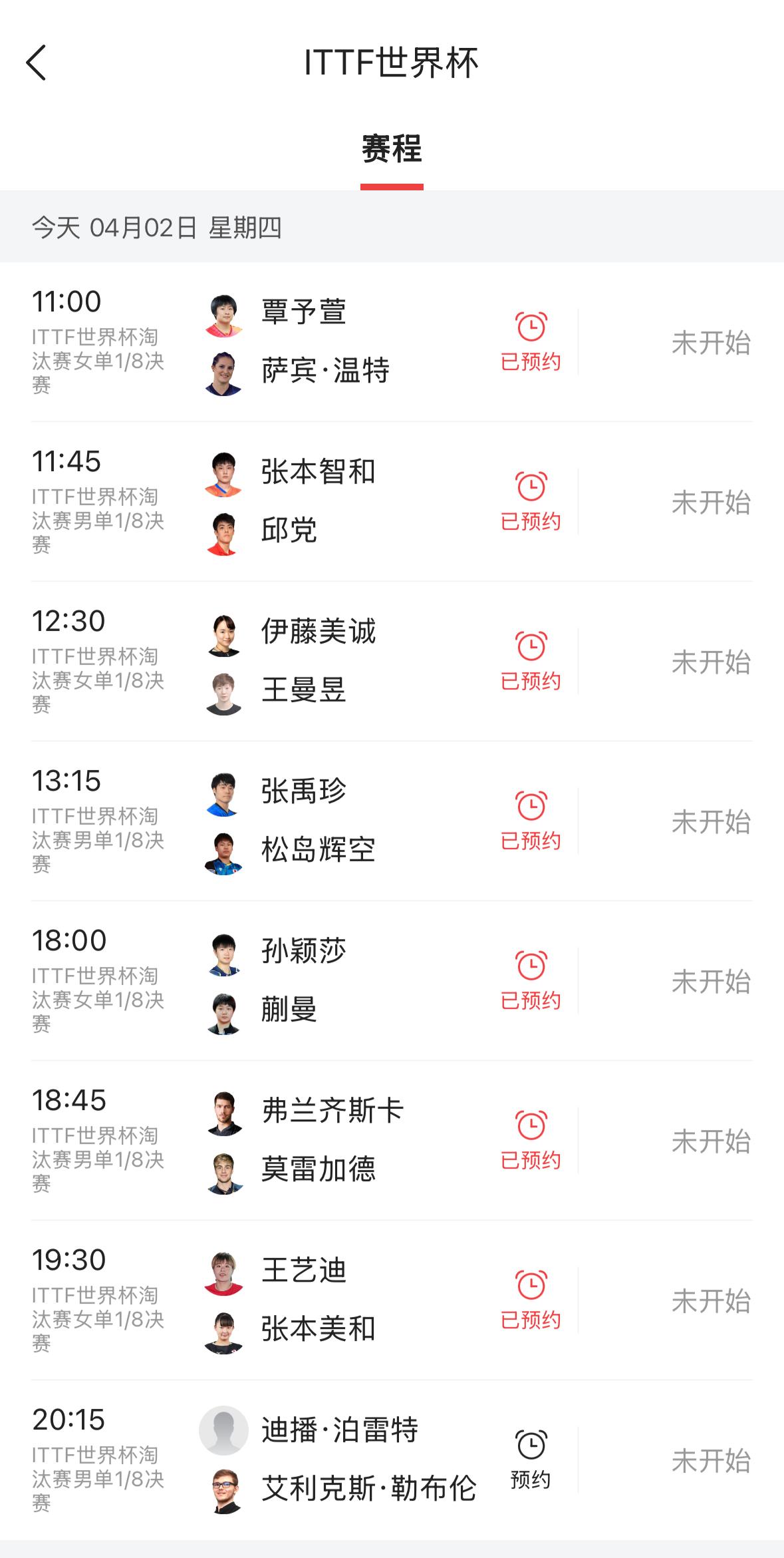 2026澳门世界杯,4月2日,男单和女单都进入八分之一决赛阶段,赛程安排8场对决: 11:00,中国队的覃予萱对阵德国队的温特,覃予萱潜力巨大,昨日刚刚打败日本队的早田希娜,彰显了她的巨大实力,今日对阵德国老将温特,很有看头。 11:45,日本队的张本智和对阵德国队的邱党,对阵双方都是外籍华裔,双方的球技都很有实力,预测张本智和的胜算大一点。 12:30,日本队的伊藤美诚对战中国队的王蔓昱,预测大概率积分排名世界第二的王蔓昱胜出。 13: 15,韩国队的张禹珍对阵日本队的松岛辉空,松岛辉空近期球技大涨,少年气盛,昨日赛球像玩儿一样快速完胜,今日与张禹珍的对决,松岛辉空的胜算更大。 18:00,中国队的孙颖莎对阵中国队的蒯曼,队内绝杀,上一次孙颖莎输给了蒯曼,这一次孙颖莎大概率会赢,正好检验这段时间在成都封闭训练的效果。 18:45,瑞典队的莫雷加德对阵德国队的弗朗西斯卡,狭路相逢勇者胜。 19:30,中国队的王艺迪对战日本队的张本美和,张本美和刚刚获得重庆冠军赛的世界冠军,实力不容小觑,王艺迪要有充分的困难准备。 20:15,是一场法国队的队内对决。 今天即将展开的8场八分之一决赛,前面的7场我都很关注,都在手机上预约了收看。 期待今日八分之一决赛的精彩呈现!