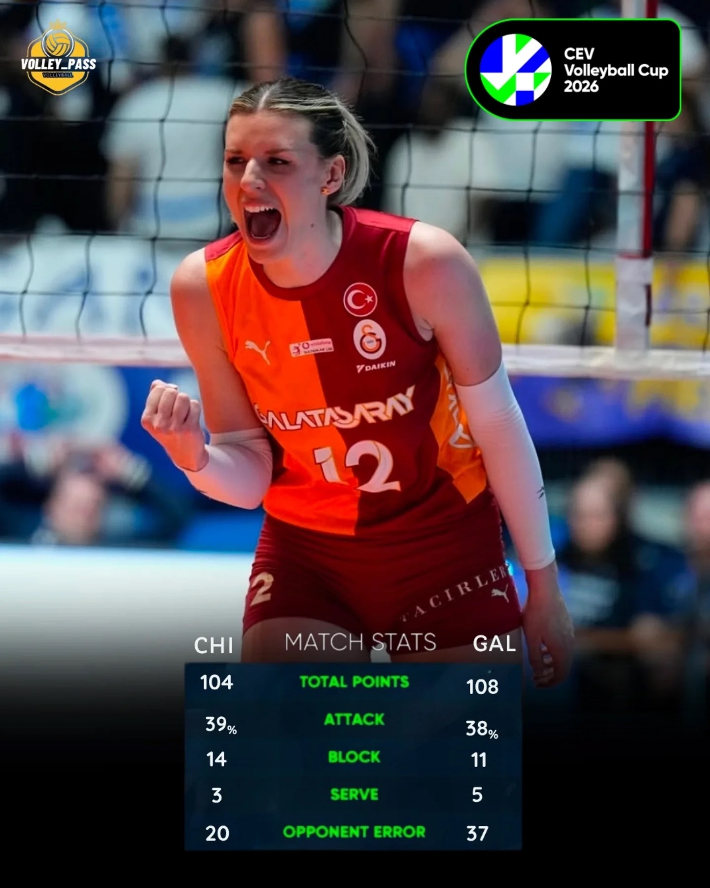 CEV杯女排决赛首回合战报🔥基耶里2比3加拉塔萨雷,五局比分:18-25/25-20/18-25/25-18/18-20加拉塔萨雷客场抢下关键胜利,为夺冠抢占巨大优势!MVP:Alexia Carutasu(28分)王媛媛发挥稳定,12扣8中(67%成功率),砍下11分(8扣+2拦+1发),助力球队拿下首回合主动权。次回合4月8日伊斯坦布尔见!