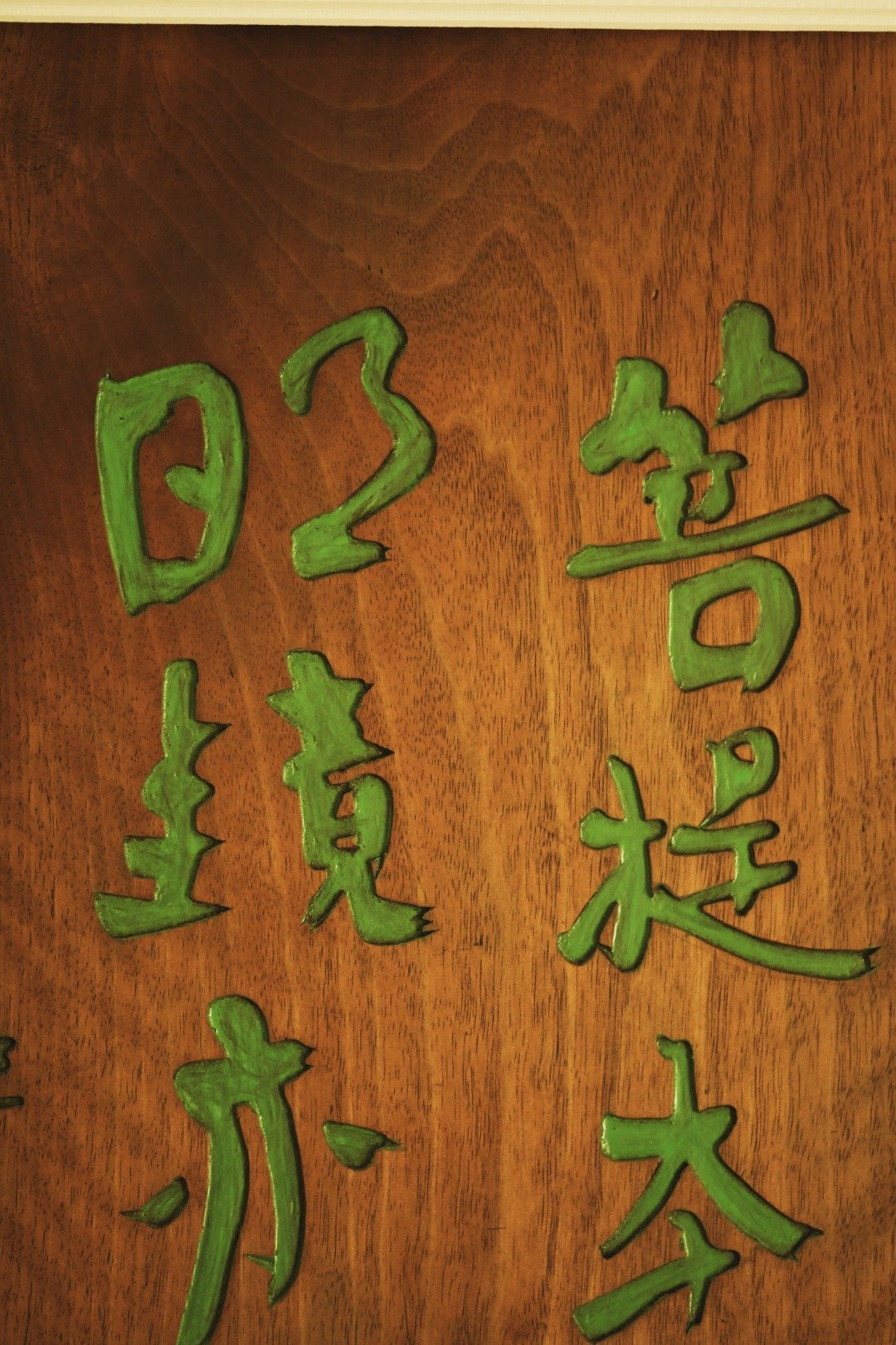 题识:“菩提本无树,明镜亦非台。。”老楠木原皮壳料手工刻画,大漆描绘,字体酣畅浑厚,苍劲有力,悬于厅堂,可添雅蕴。