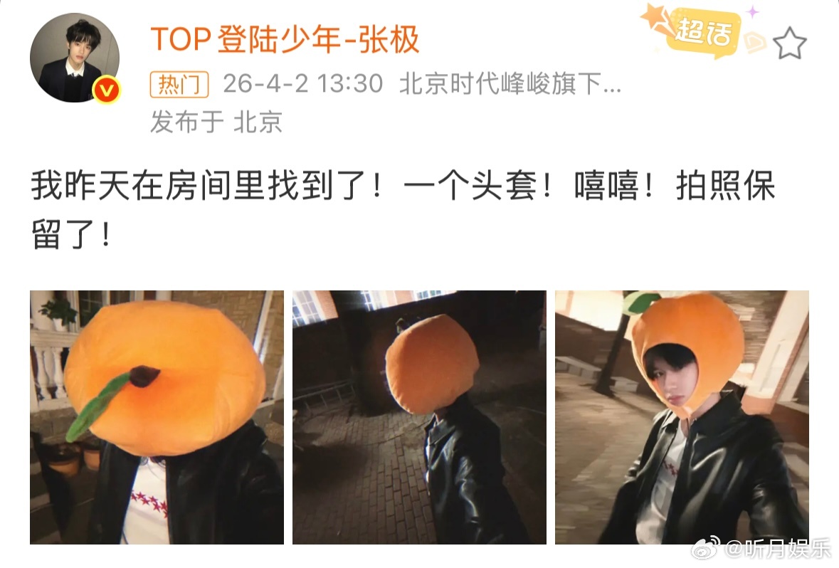 张极橘子头套 WOW是新鲜的张极!好想戳一下这个可爱的小橘子的脸蛋