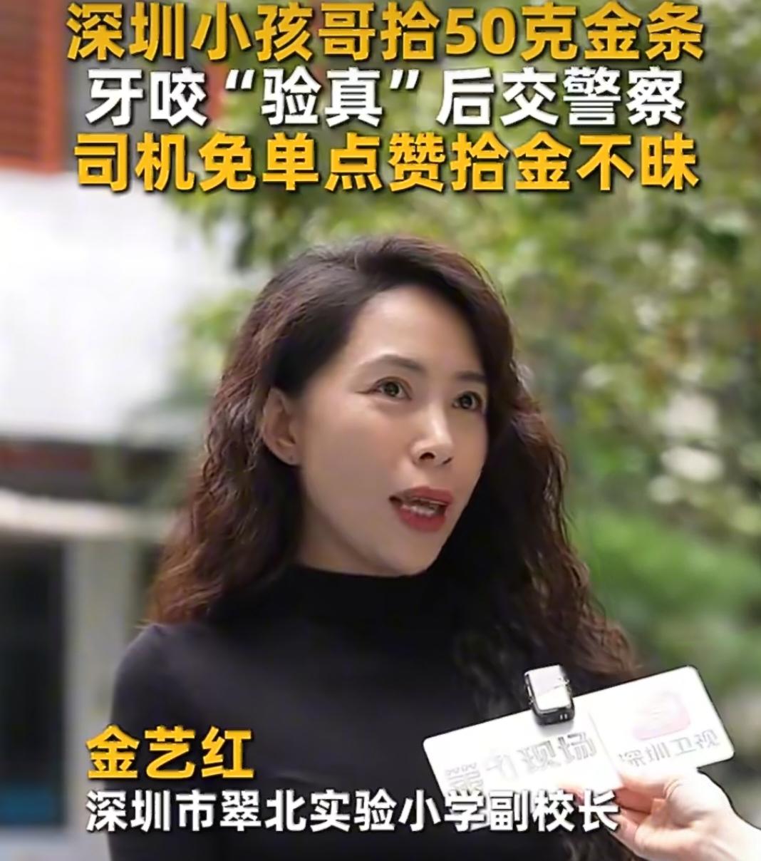 深圳一名小学生捡到50克金条,用牙齿咬一下确认是真的后主动上交给警察! 深圳翠北实验小学五年级的李麒瑞,上学路上捡到一根50克的大金条。这孩子第一反应不是自己留着,而是先咬了一口验真假,确认是真金后,立马交给了警察叔叔。 事后,老师陪同李麒瑞前往派出所处理后续事宜,途中搭乘出租车时,司机师傅听说此事后大为感动,坚持免收车费。说就当给拾金不昧的好孩子点赞了! 学校的副校长说,这孩子平时就特别正直,这事完全是他自主做的选择,没有半点犹豫。 说真的,小小年纪面对几万块的黄金,一点不心动,还想着失主肯定着急,想着老师和家长对自己的教育,不是自己的东西,坚决不要!这才是咱们该给孩子看的正能量,比多少说教都管用! 为这个拾金不昧的深圳小孩哥,还有暖心的出租车司机,点个赞吧!深圳黄金事件 路边的金条 丢失的金条 深圳路边捡金条 学生
